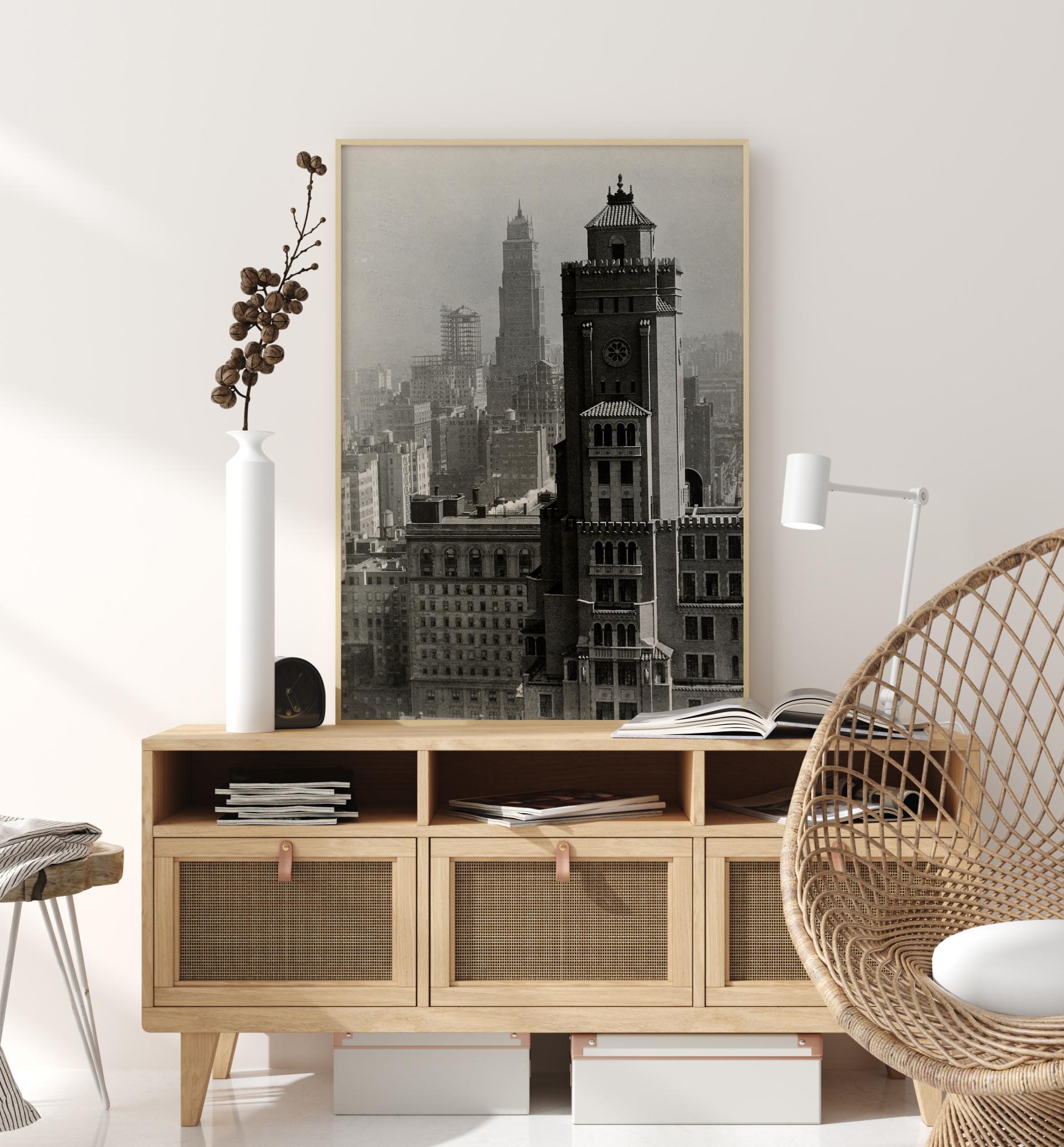 Mustavalkoinen printti vanhasta kaupungista. Harmaa horisontti sulautuu täydellisesti samaan harmaan värisiin rakennuksiin. Kaupunki koostuu erikorkuisista rakennuksista. Etualalla luonnonvalo paistaa suoraan päärakennuksen itäpuolelle. Ripusta tämä printti työhuoneeseesi ja tarkkaile vanhaa kaupunkia.
