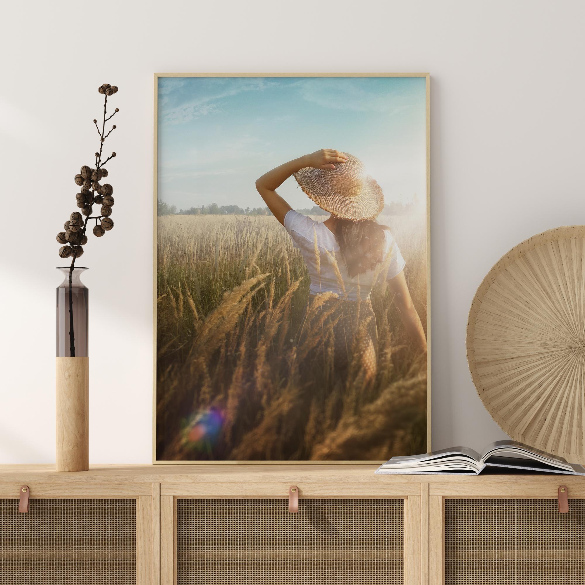 Rentouttava ja raikas kuva, jossa on olkihattuinen nainen vehnäpellolla. Kaunis sininen taivas kohtaa kultaisen vehnäpellon. Nuori nainen kädet päänsä päällä kulkee pelloilla nauttien raikkaasta ilmasta. Ihanteellinen printti kaikille, jotka arvostavat luonnon kauneutta.