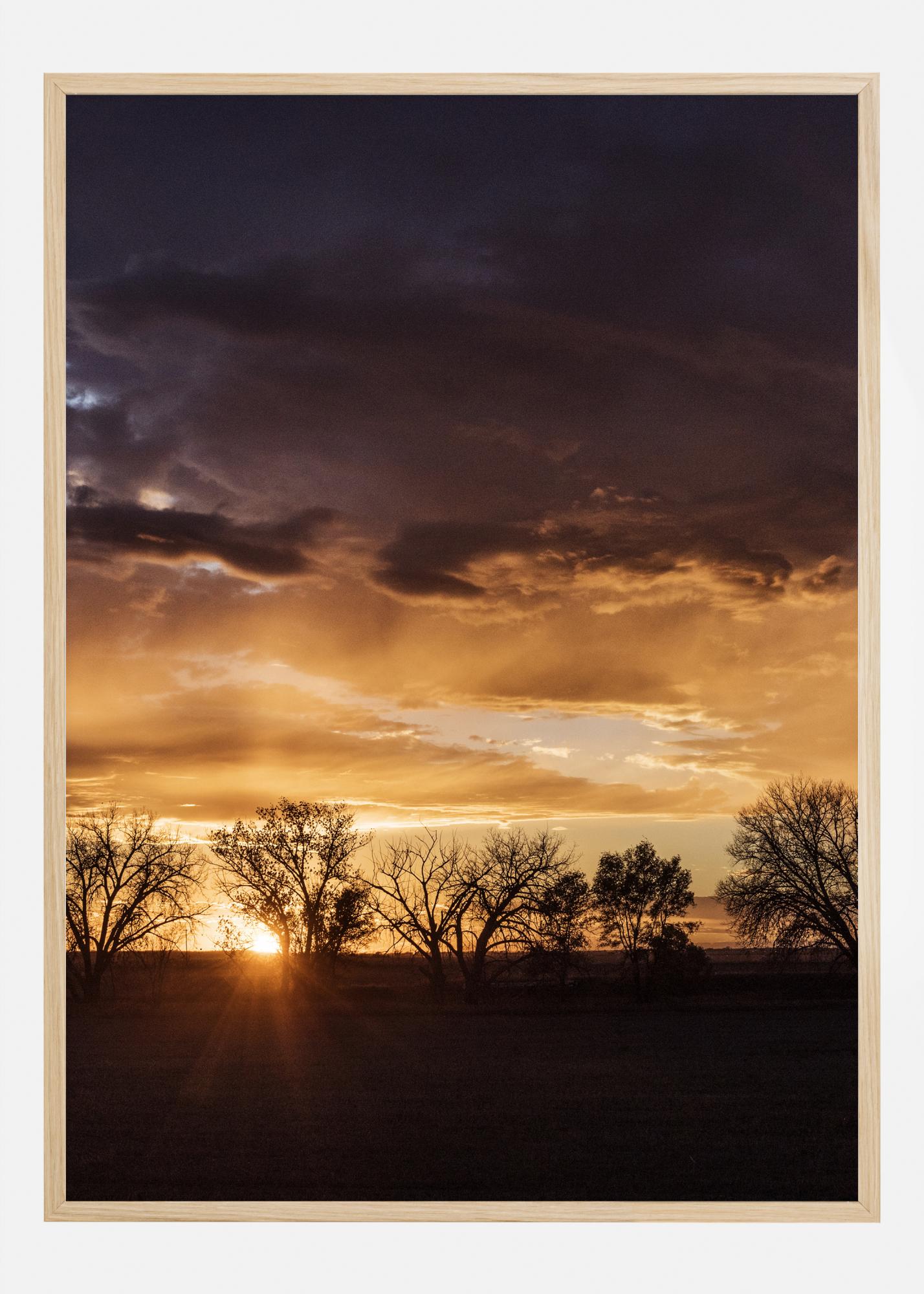 Henkeäsalpaava kuva oranssista auringonlaskusta. Horisontissa näkyvä auringonlasku korostaa peltojen syksyisiä puita. Upealla taivaalla oranssin sävyt luovat lämpimän ja rauhoittavan tunnelman. Upea kuva, joka tuo lämpöä olohuoneeseesi.