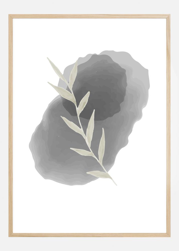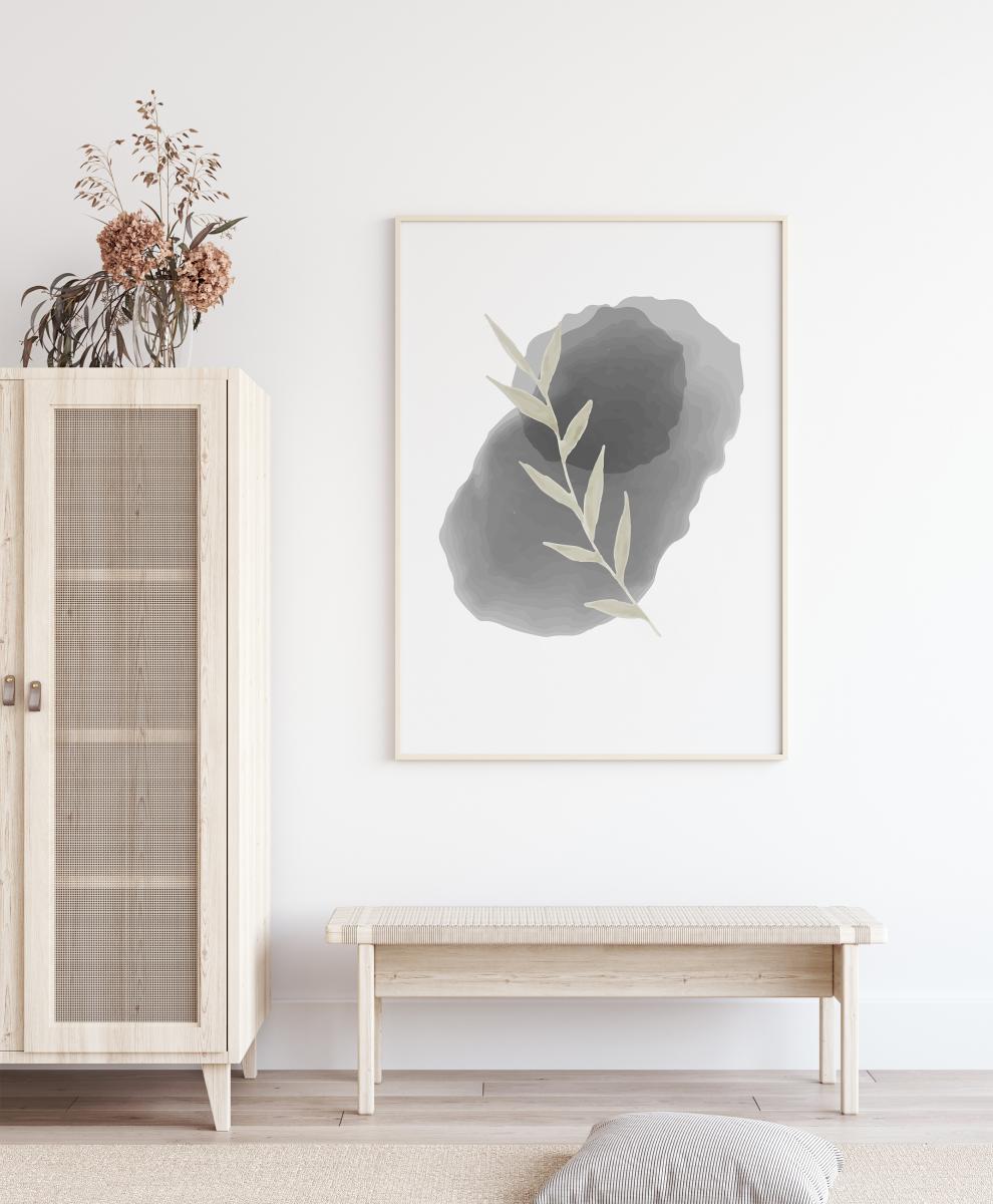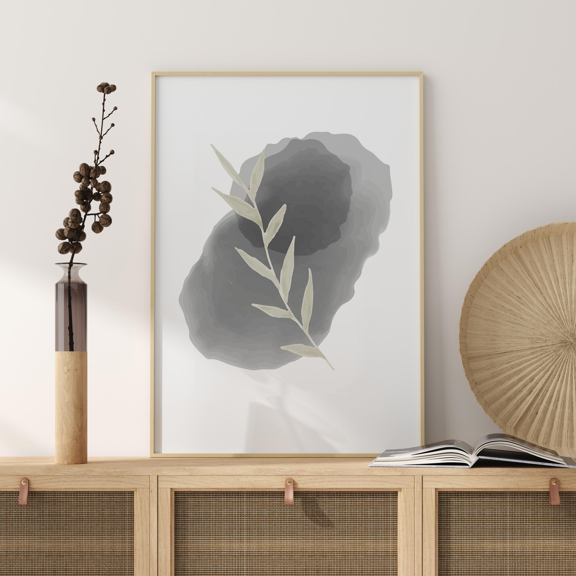 Yksinkertainen vedos beigenvärisestä lehdestä, joka on sijoitettu soikean muotoisen kiven päälle. Valkoisella pohjalla oleva lehti on kahden eri kiven päällä: pieni musta kivi on sijoitettu isomman beigenvärisen kiven päälle. Tuo kotiisi ripaus herkkyyttä tällä kuvalla.