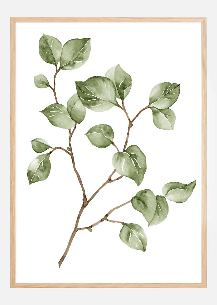 Kaunis maalaus ohuesta ruskeasta oksasta, jossa on pieniä vihreitä lehtiä. Valkoiselle pinnalle maalatut pehmeät ruskeat ja vihreät sävyt korostavat lehtien herkkiä valkoisia syitä. Kaunis maalaus ripustettavaksi vaaleanvihreälle seinälle.