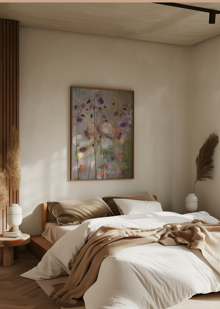 Upea käsinmaalattu kuva violeteista ja valkoisista kuivakukista. Beigenväriselle taustalle asetetut kukkien luonnolliset värit luovat rentouttavan tunnelman. Pehmeät vihreät, violetit ja oranssit sävyt ovat erittäin helliä silmälle. Kaunis kuva ripustettavaksi pukeutumispöydän viereen.