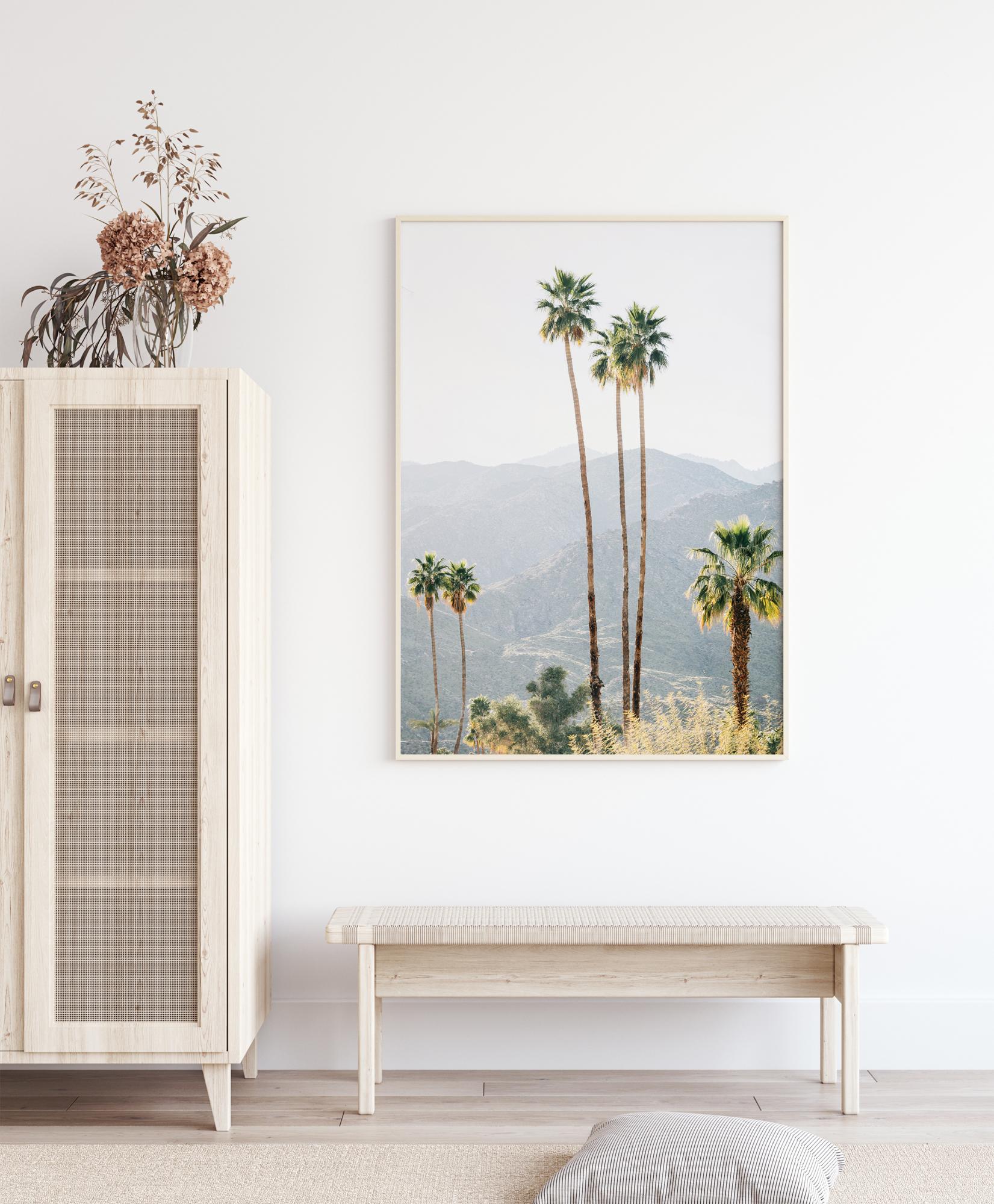 Panoraamakuva mäkisestä maisemasta aurinkoisena iltapäivänä. Pilvinen taivas sulautuu täydellisesti kaukaisiin kukkuloihin, kun taas palmut ovat korkealla etualalla. Aurinko paistaa kirkkaasti palmupuiden päälle ja antaa kuvalle lisää lämpöä. Täydellinen kuva mihin tahansa huoneeseen kodissasi.