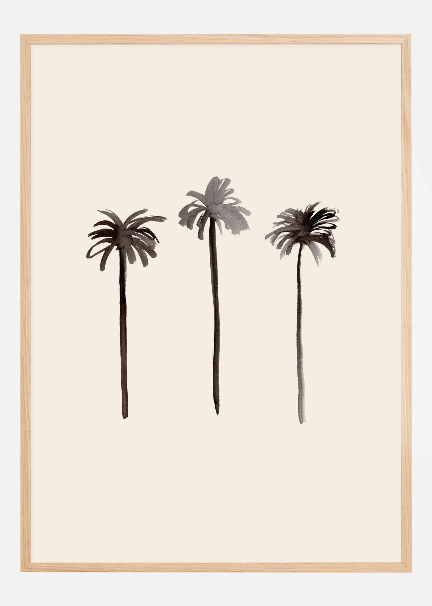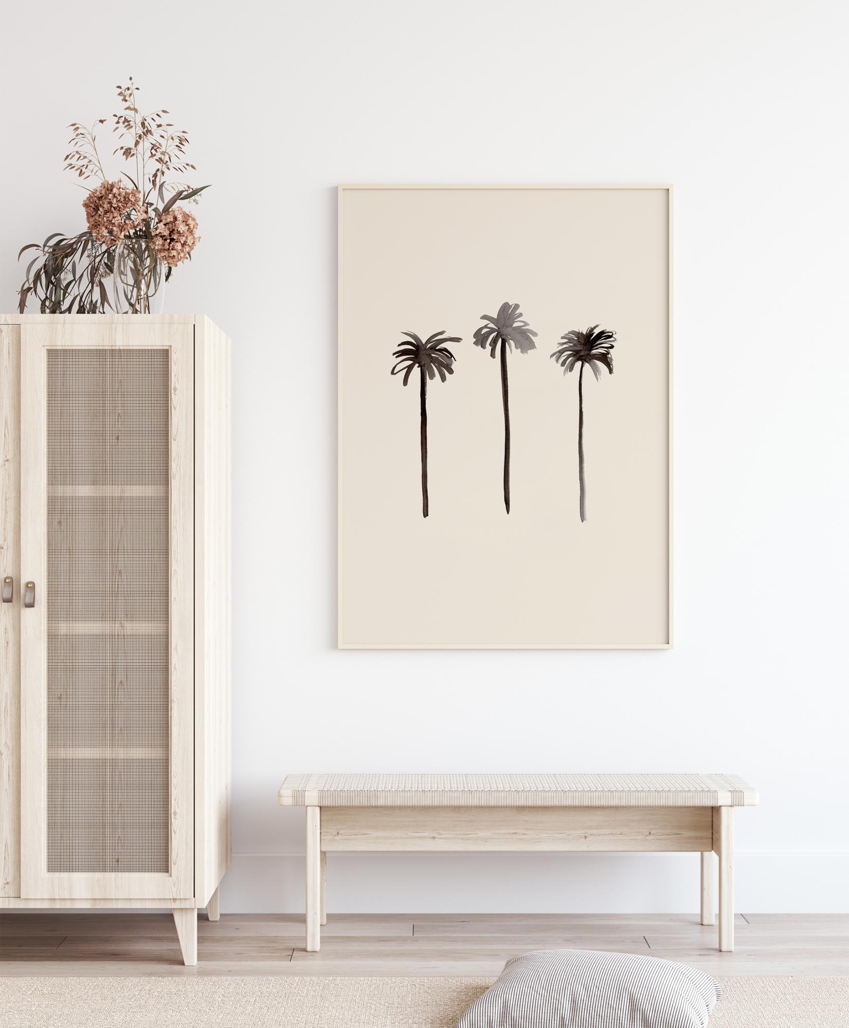 Yksinkertainen mustavalkoinen kädellä tehty kuva, jossa on kolme palmua peräkkäin. Beigeen taustaan on asetettu mustan eri sävyjä, joilla on luotu lehtien tummuus. Yksinkertainen kuva olohuoneen seinälle ripustettavaksi.