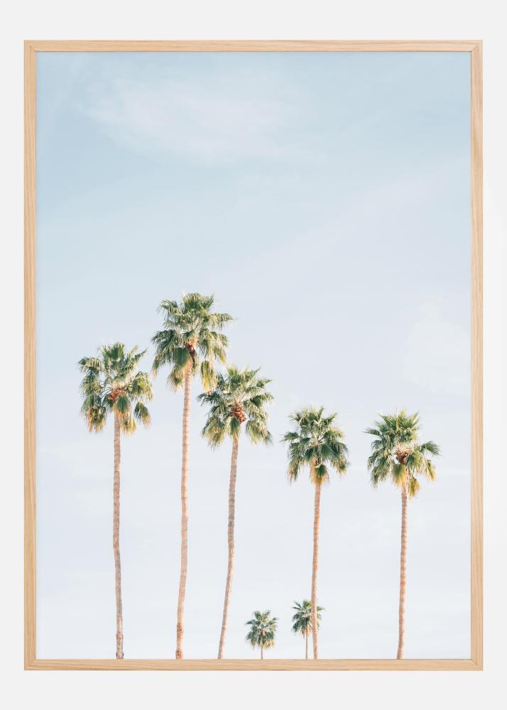 Ihastuttava printtikuva, jossa on viisi palmua peräkkäin. Vaaleansininen taivas sulautuu täydellisesti palmujen pehmeisiin vihreän ja ruskean sävyihin. Kaukana näkyy kaksi muuta palmua. Kaunis printtikuva ripustettavaksi vaaleansiniselle seinälle.