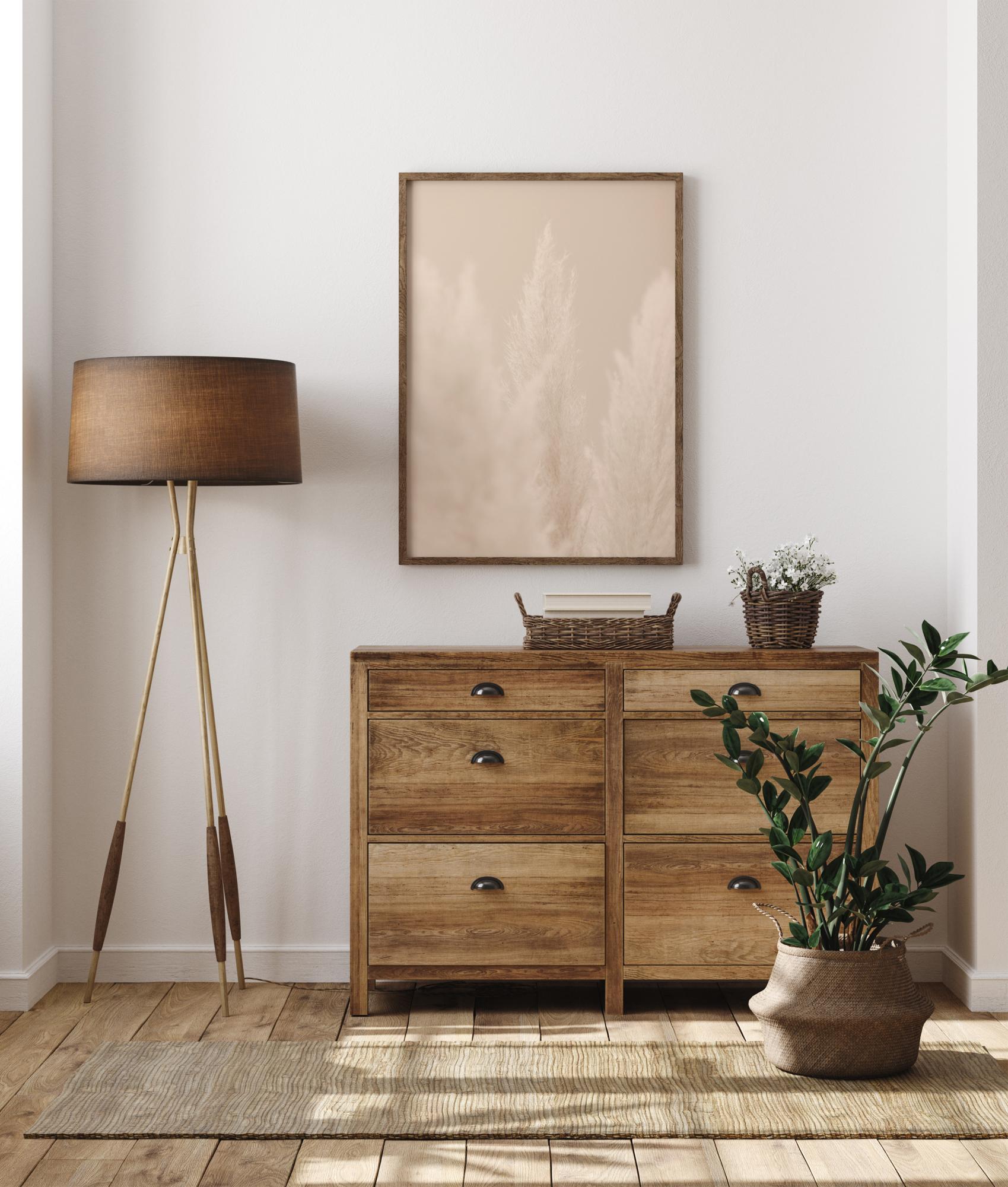 Enkelimäinen juliste lähikuvassa olevista pampasruohon päistä. Eksy tämän yksinkertaisen, mutta tyylikkään julisteen pörröisen pilvimäiseen otokseen. Yhdistä tämä muiden pastellivärien kanssa saadaksesi todella eteerinen ilme kotiisi.