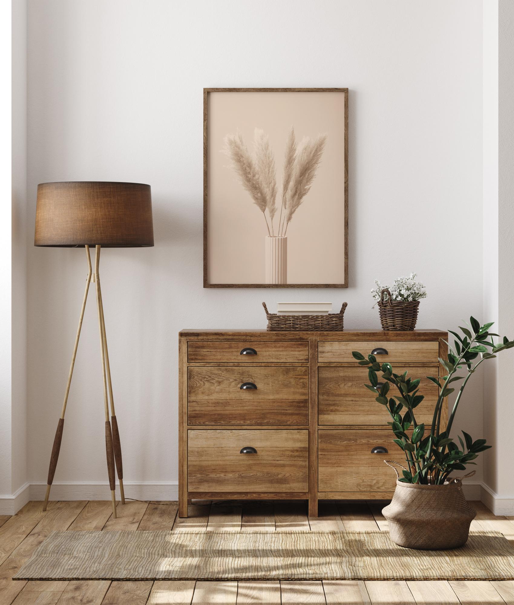 Kukkajuliste pampasruohosta maljakossa. Ruohonpäät erottuvat vaaleanpunaista seepiapunaista taustaa vasten, mikä lisää pehmeyttä siinä, missä maljakko on kova. Ripaus eleganssia kotiisi.