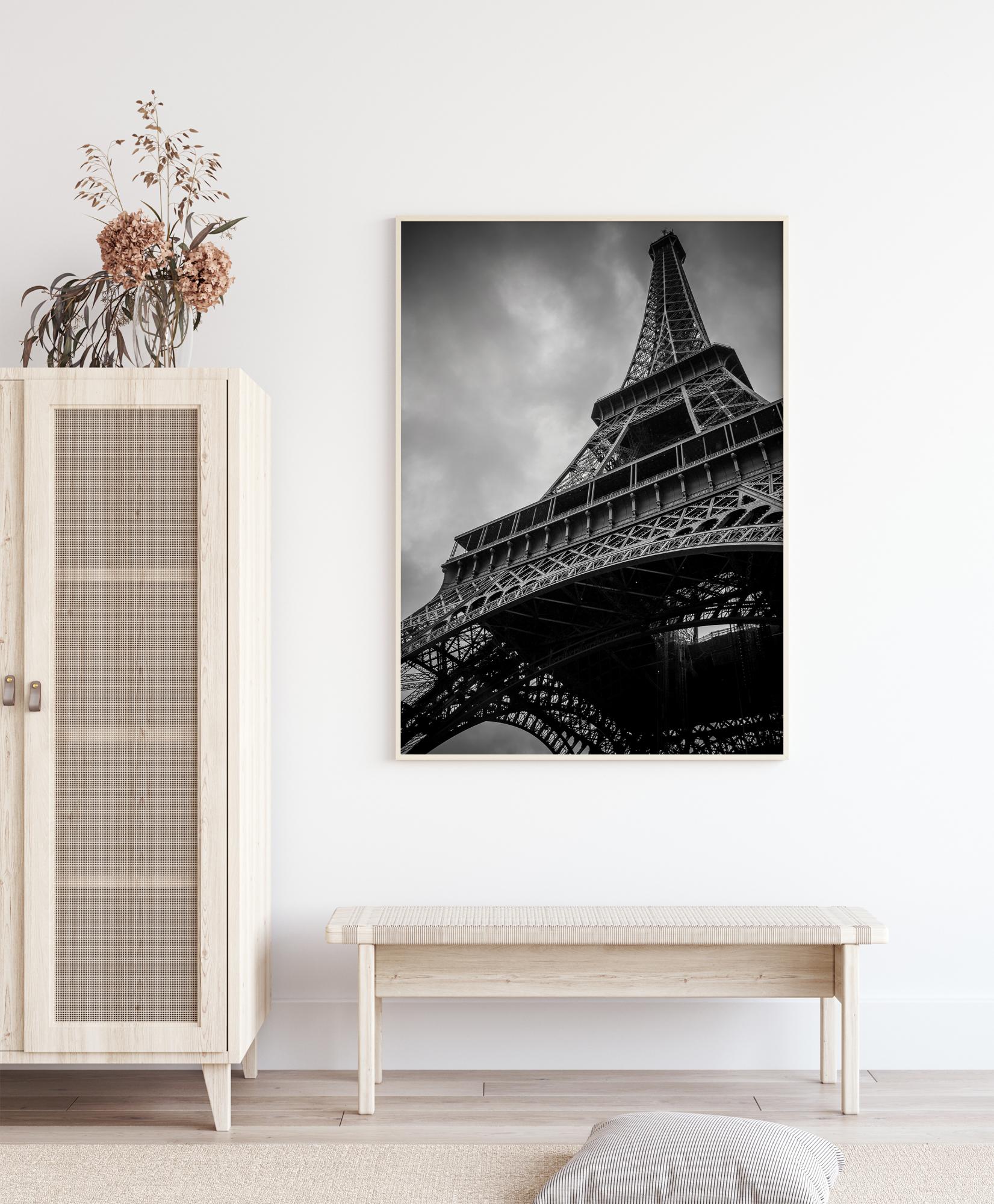 Alhaalta ylöspäin suuntautuva perspektiivikuva henkeäsalpaavasta Eiffel-tornista. Pilvisen harmaalla taivaalla tämä kaunis rautarakenne tuo esiin pyramidin kaltaisen muotonsa noustessaan korkealle. Tämä on ihanteellinen lahja kaikille Pariisista pitäville.