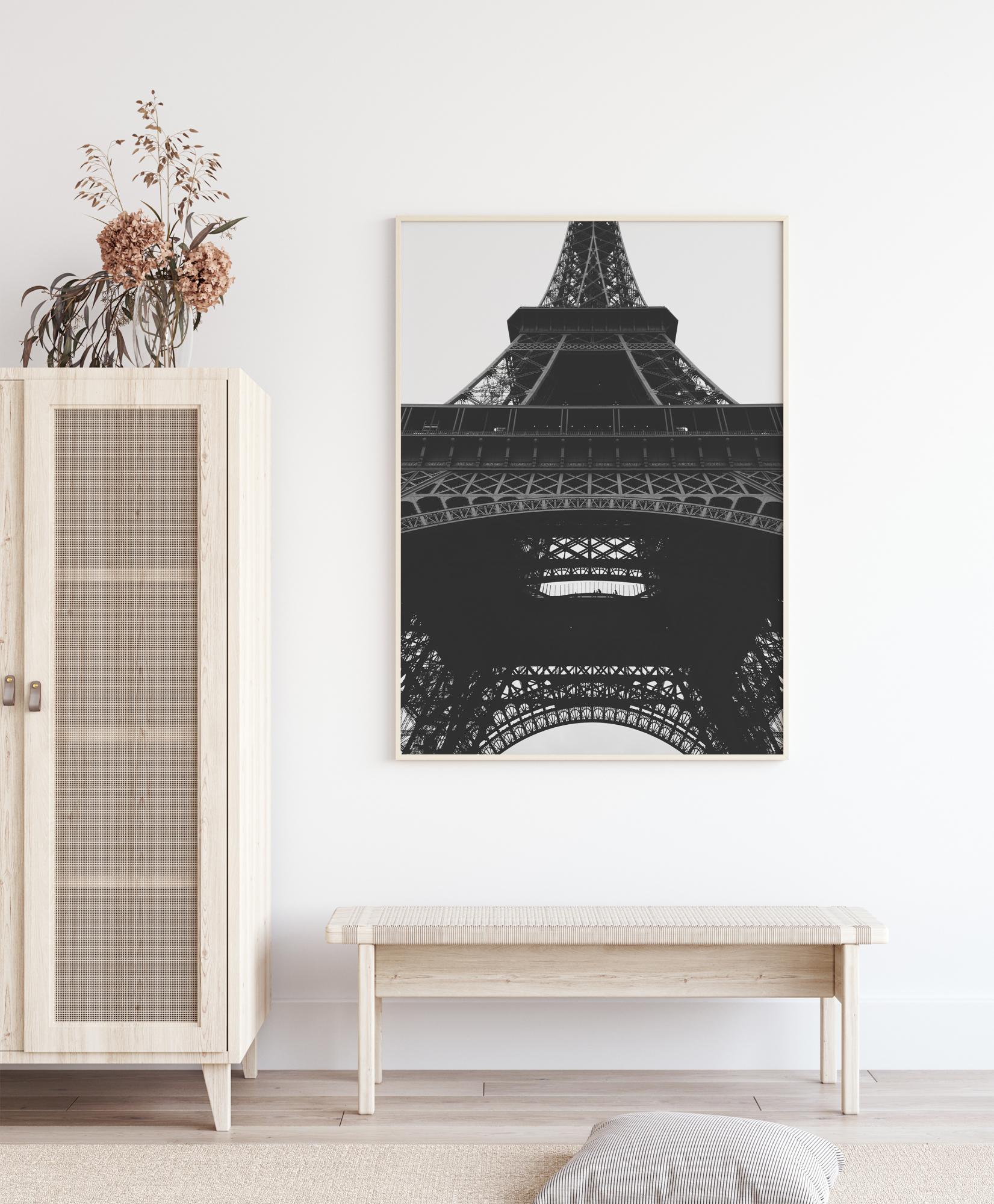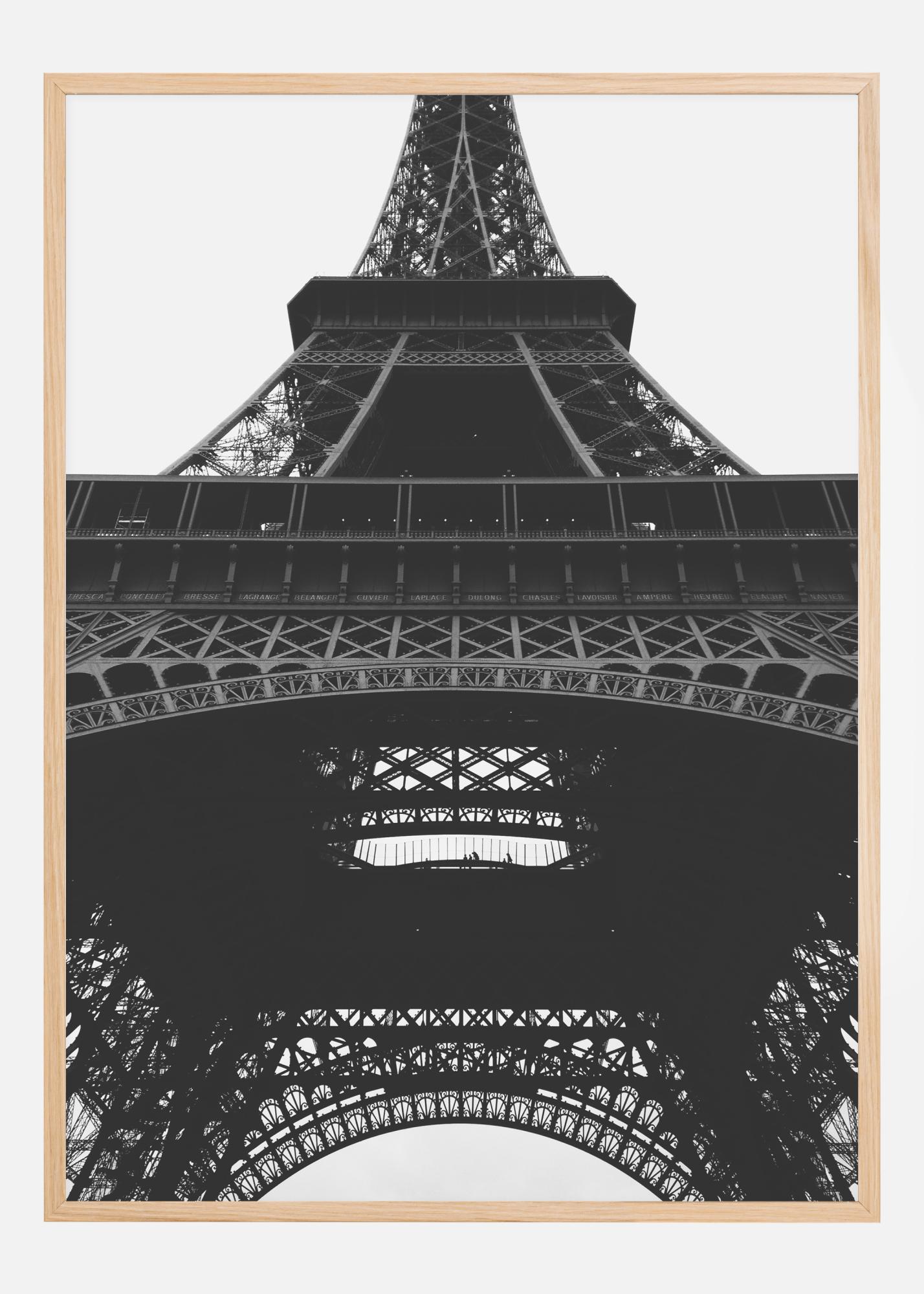Upea mustavalkoinen juliste Eiffel-tornista. Alhaalta ylöspäin kuvattuna vankka rautarakenne sulautuu täydellisesti harmaaseen taivaaseen. Tämä teknologinen mestariteos luo kevyen ja ilmavan mutta vahvan rakenteen. Täydellinen juliste ripustettavaksi moderniin ympäristöön.