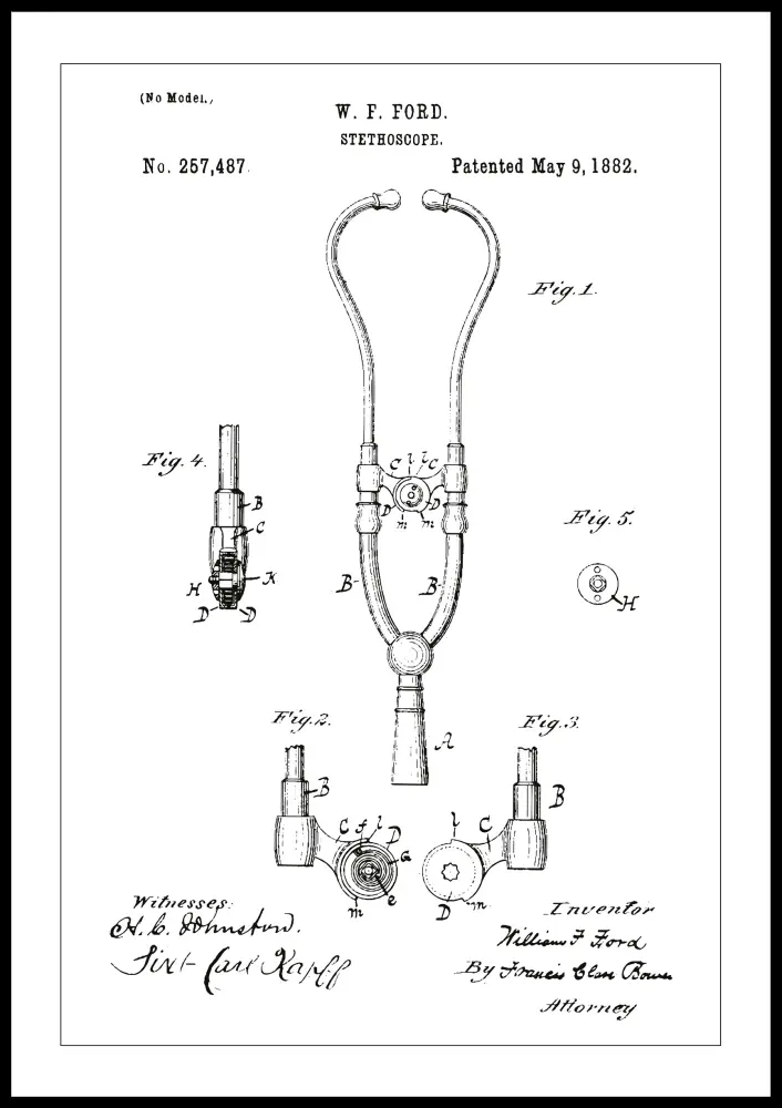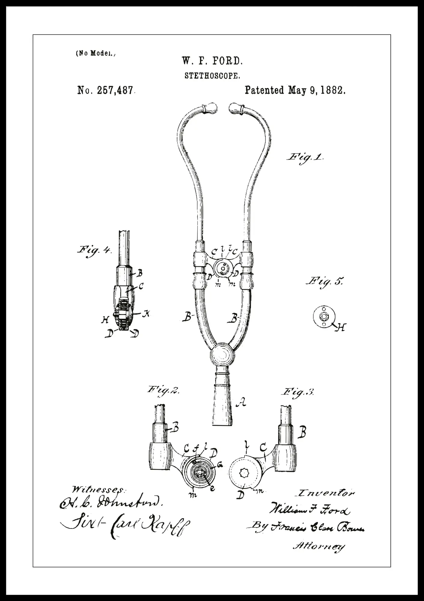 Patenttipiirustus - Stetoskooppi - Valkoinen Juliste (21x29.7 cm (A4))