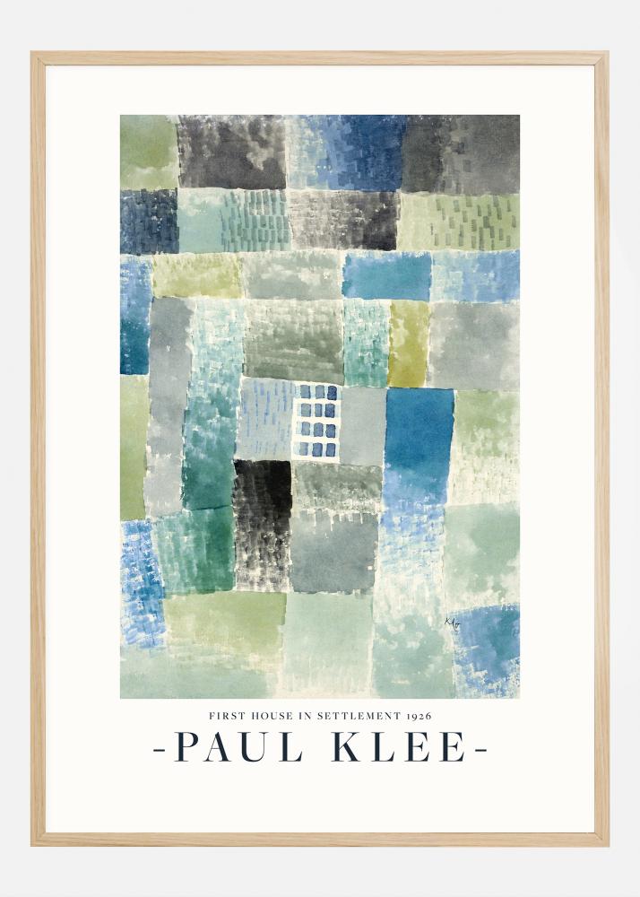 Tämä elävä posteri Paul Kleen teoksesta "Ensimmäinen talo siirtokunnassa" vuodelta 1926 on mosaiikki väristä ja muodosta, jotka kietoutuvat yhteen hurmaavaksi kaupunkinäkymäksi. Monisärmäiset neliöt ja suorakulmiot luovat abstraktin maaseudun viileissä ja lämpimissä sinisen, vihreän ja harmaan sävyissä, mikä herättää pienen kaupungin rauhallisen tunteen. Klee leikkii perspektiivillä, jossa tietyt lohkot näyttävät olevan etualalla ja toiset taustalla, mikä sallii silmän vaeltaa teoksen vaihtelevassa maisemassa.
