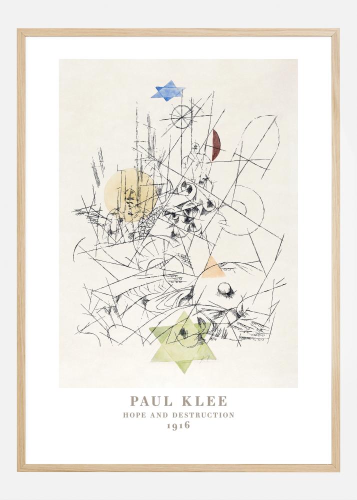 Tämä taiteellinen juliste kuvaa Paul Kleen teosta "Toivo ja tuho" vuodelta 1916, ja se vangitsee ainutlaatuisen yhdistelmän abstraktia taidetta ja symboliikkaa, joka on tyypillinen Kleen tyyli. Kuva on rikas linjoilla ja muodoilla, jotka vuorovaikuttavat komposition pinnalla, mikä luo sekä järjestyksen että kaaoksen tunteen. Tämä on printti, joka voisi viehättää niitä, jotka arvostavat sekä modernia että nykytaidetta, ja se on ihanteellinen tuomaan pohdiskelevaa ulottuvuutta mihin tahansa huoneeseen tai toimistoon.