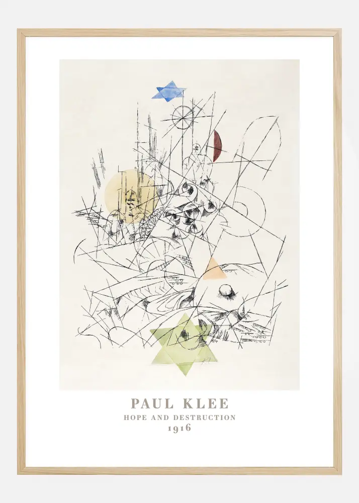 Tämä taiteellinen juliste kuvaa Paul Kleen teosta, nimeltään "Toivo ja tuho" vuodelta 1916, ja se vangitsee ainutlaatuisen yhdistelmän abstraktia taidetta ja symboliikkaa, joka on ominaista Klee tyylille. Aihe on rikas linjoiltaan ja muodoiltaan, jotka ovat vuorovaikutuksessa sommitelman pinnalla, luoden tunteen sekä järjestyksestä että kaaoksesta. Tämä printti voisi viehättää niitä, jotka arvostavat sekä modernia että nykytaidetta, ja se on ihanteellinen lisäys ajatuksia herättävän ulottuvuuden tuomiseen mihin tahansa huoneeseen tai toimistoon.