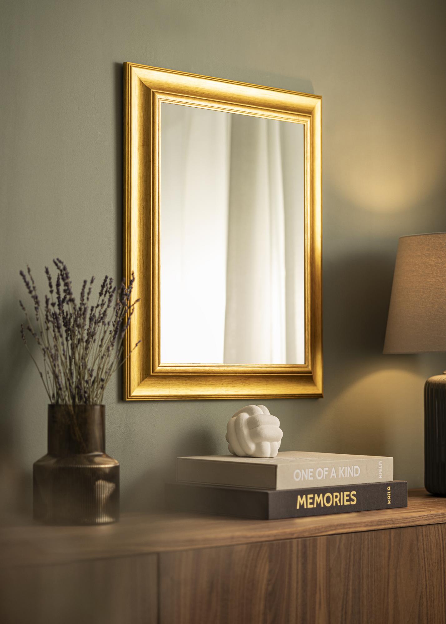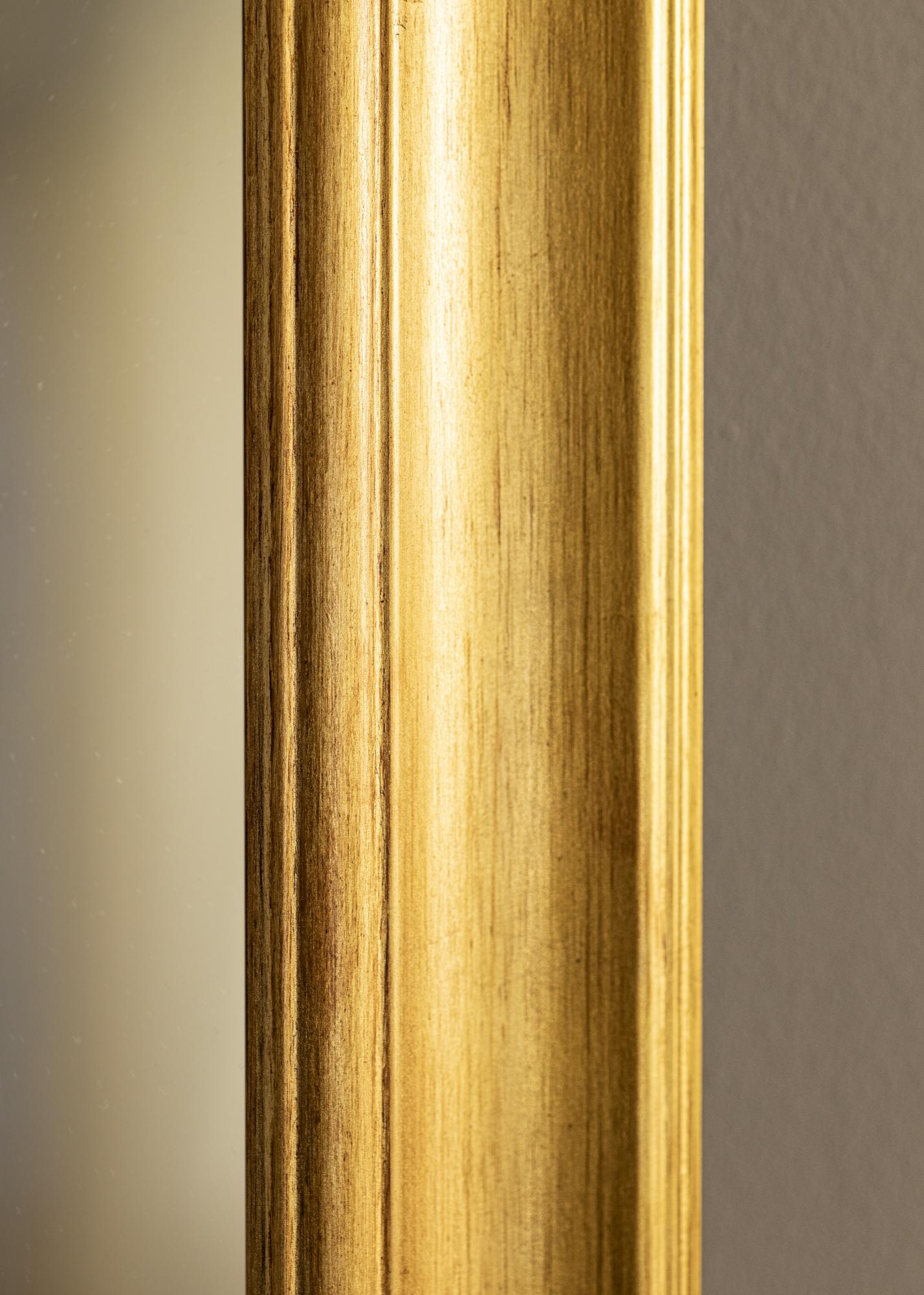 Kehys on valmistettu männystä ja siinä on kaunis antiikkikultainen viimeistely. Harjattu pinta hienovaraisine vaihteluineen antaa peilille kevyesti patinoituneen tunteen, mikä lisää siihen sen ainutlaatuista luonnetta. Ohuet linjat reunoilla luovat hienostuneen yksityiskohtaisen ilmeen, joka vangitsee katseen ja vahvistaa peilin klassista ilmaisua.