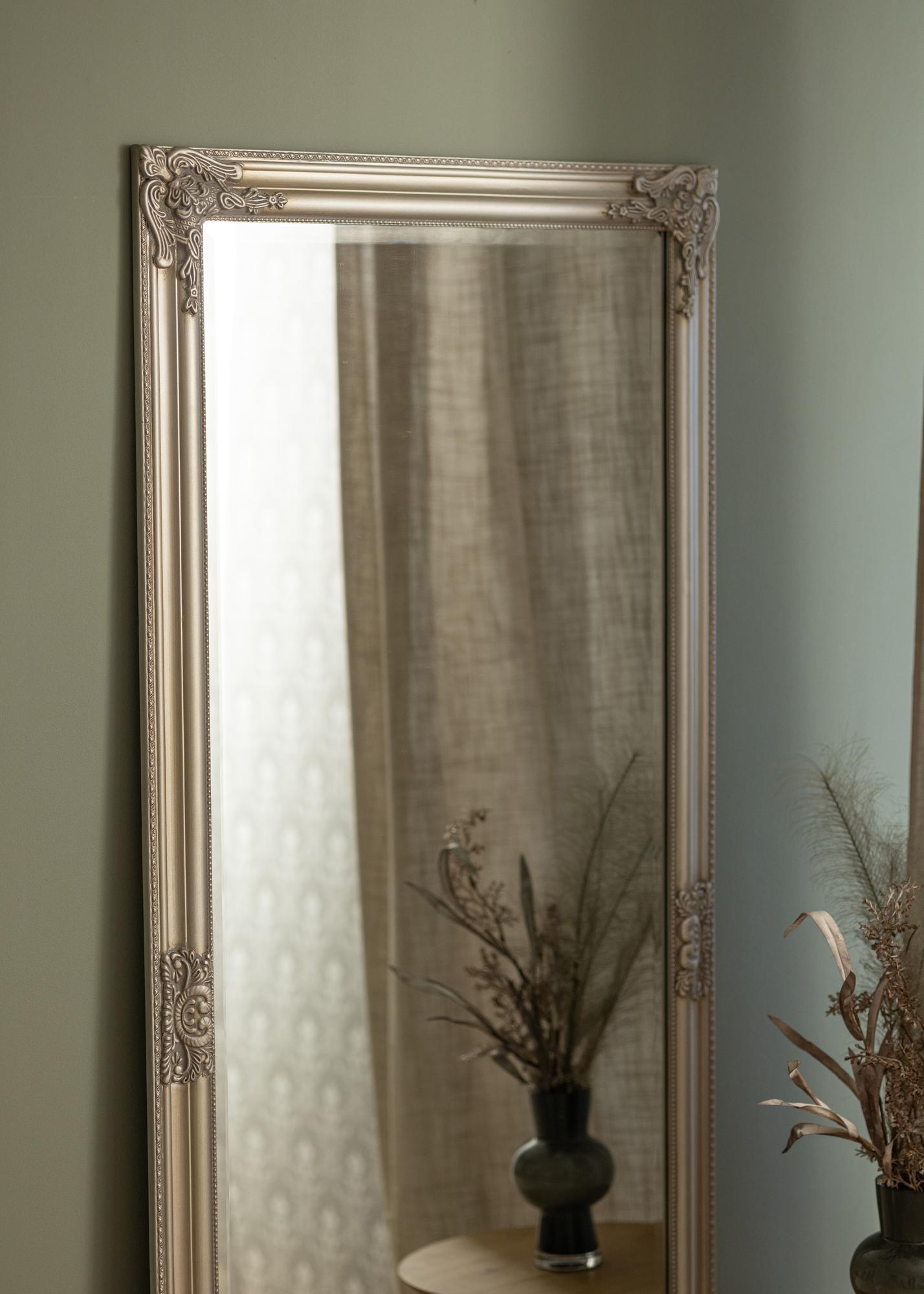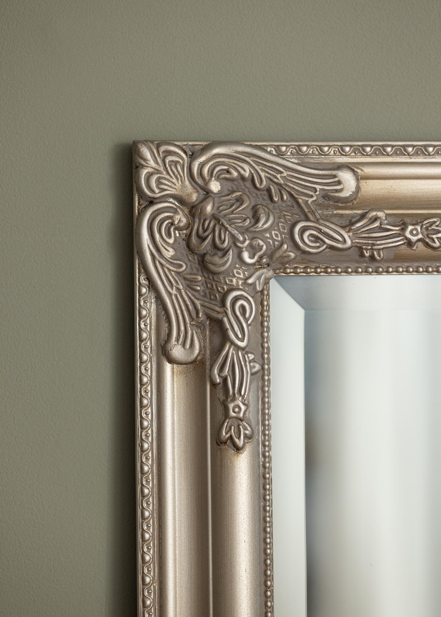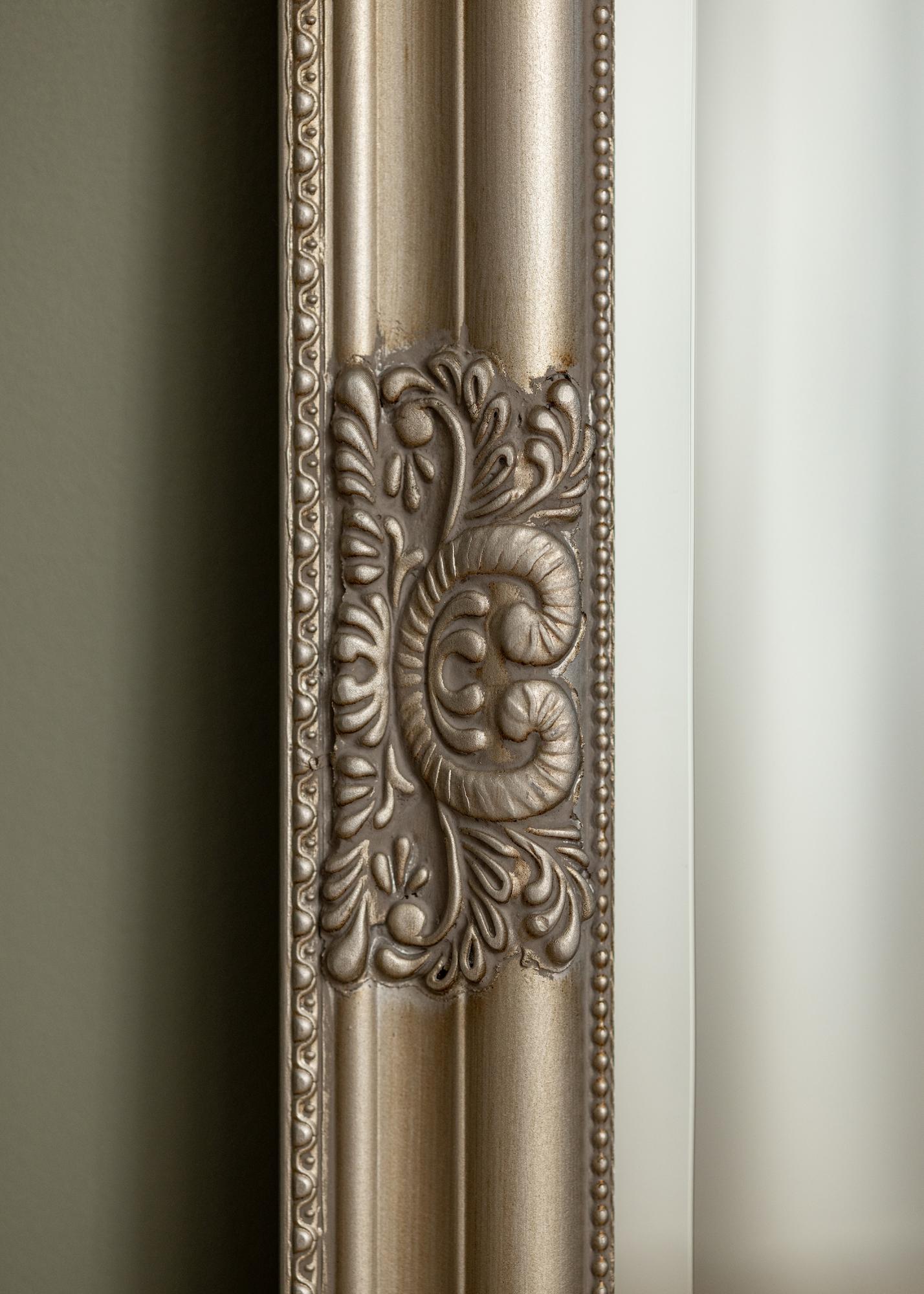 Upeasti koristeltu kehys on täynnä hienoja yksityiskohtia ja kuvioita, mikä antaa peilille vintage-henkistä charmia, jota on vaikea vastustaa. Hopeanvärinen kehys vahvistaa peilin kiiltävää pintaa ja luo ylellisen ilmapiirin huoneeseen. Tämä peili on ihanteellinen kumppani kaikille, jotka arvostavat klassista eleganssia ja haluavat luoda hienostuneen ja kutsuvan ympäristön.