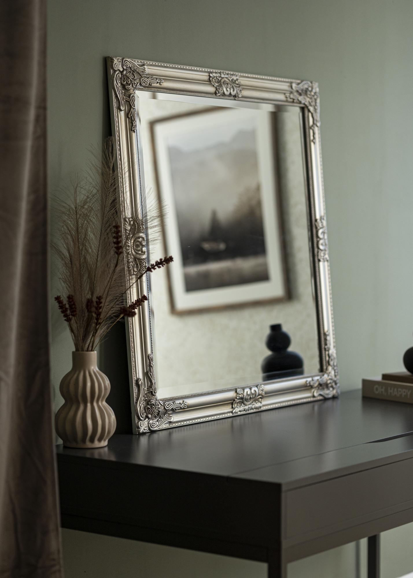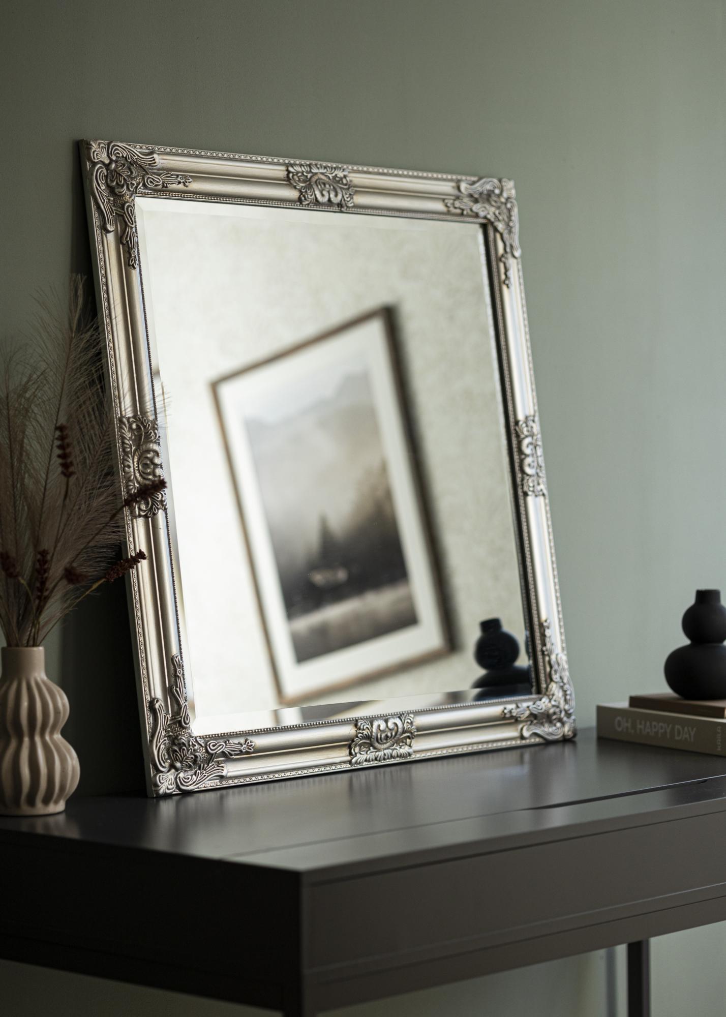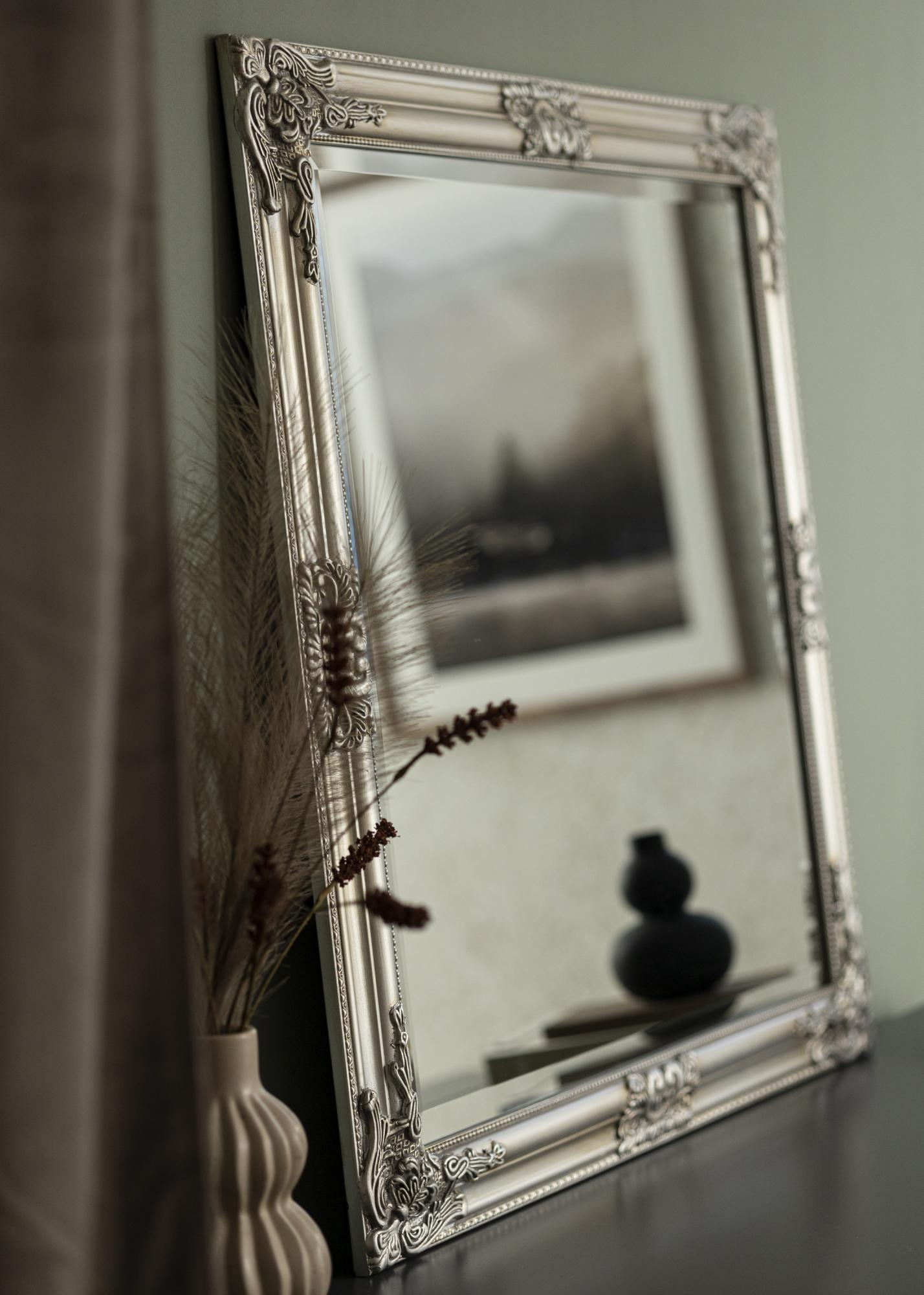 Tämän peilin kehys on todellinen katseenvangitsija, rikas yksityiskohtaisessa barokkityylisissä koristeissaan, jotka tuovat ylellisen ja historiallisen tunnelman huoneeseen. Neliömuoto antaa symmetrisen ja tasapainoisen esteettisen ilmeen, joka täydentää useimpia sisustustyylejä. Peilin hopeanvärinen kehys korostaa sen eleganttia ilmettä ja tekee siitä monipuolisen osan kotisi sisustusta.