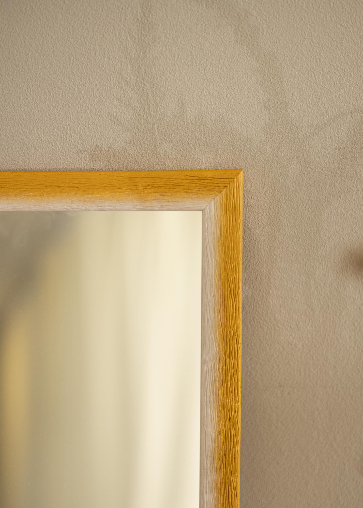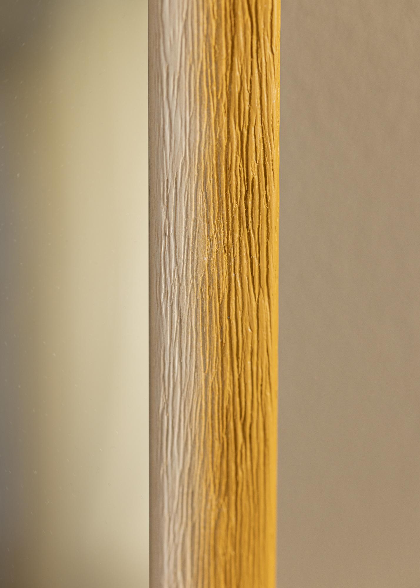 Tämä peili erottuu harmonisella värisävyllään vaaleasta, luonnonvalkoisesta sävystä lämpimään okrankeltaiseen sävyyn. Tämä hienovarainen siirtymä luo pehmeän, maalatun ilmeen, joka antaa huoneelle elävän syvyyden. Kehyksen pinta on leimattu selkeällä puustruktuurilla ja syvillä syillä, mikä antaa taktiilisen ja luonnollisen tunteen. Tämä tekee peilistä paitsi toimivan myös kodin koristeellisen yksityiskohdan.