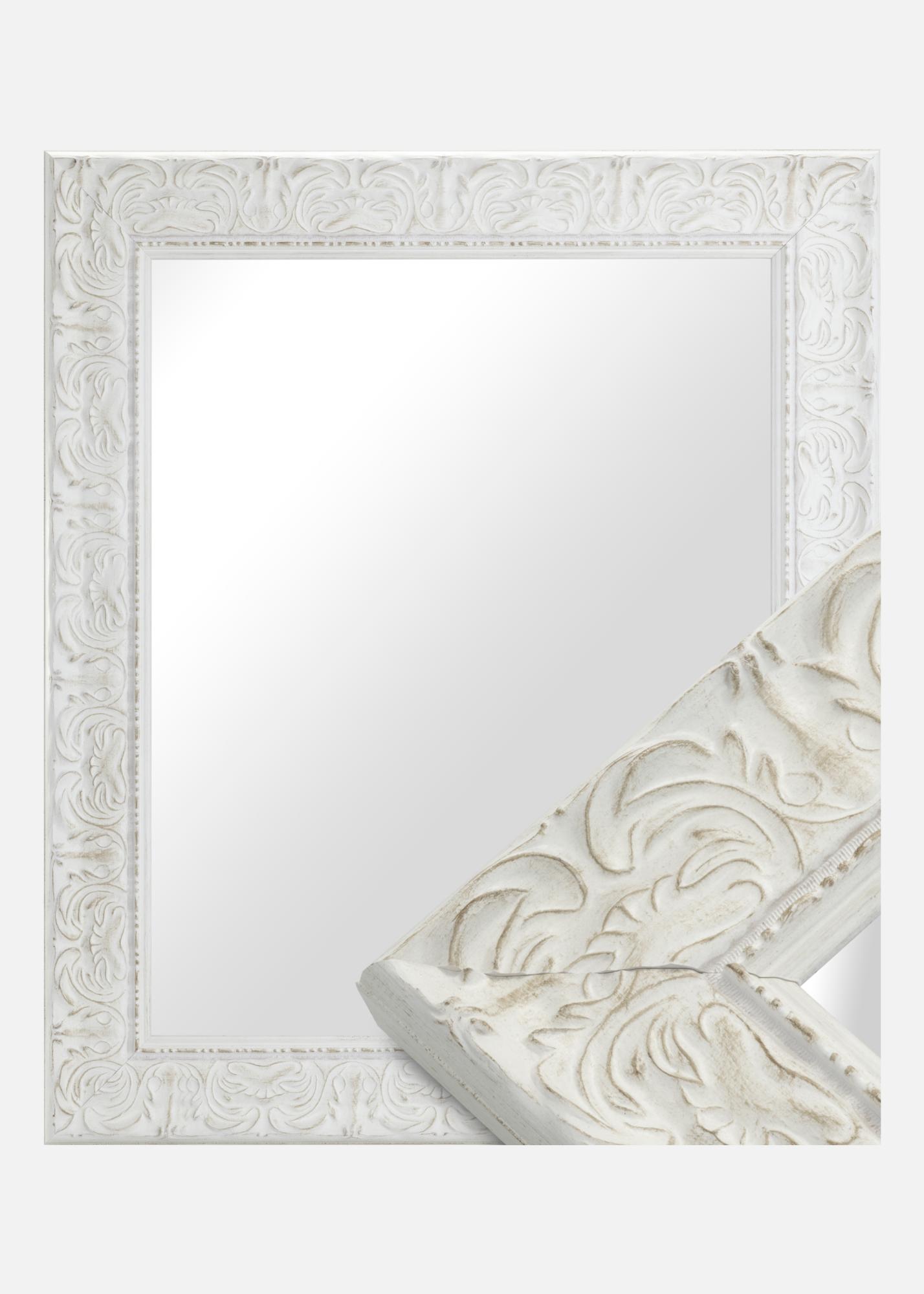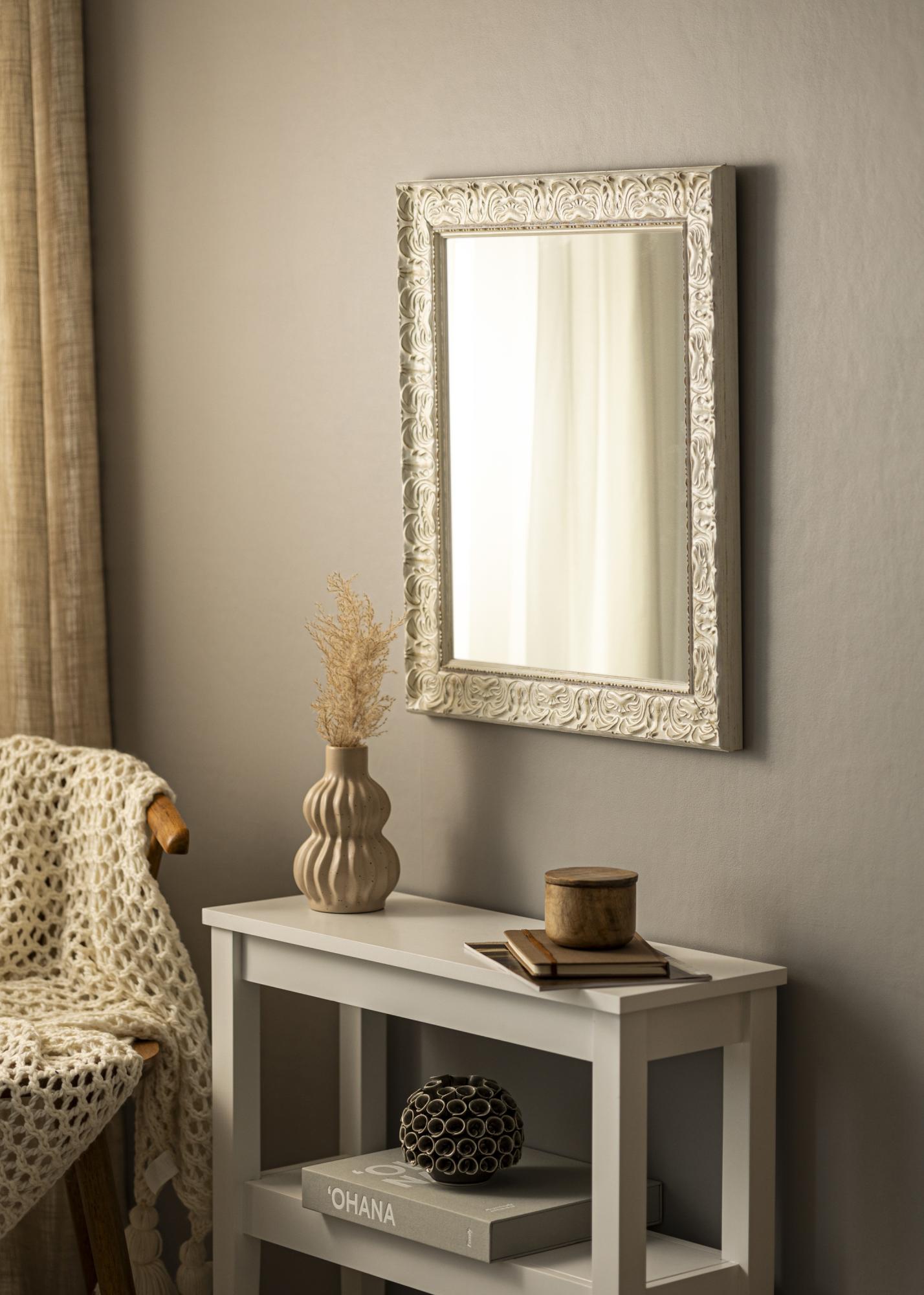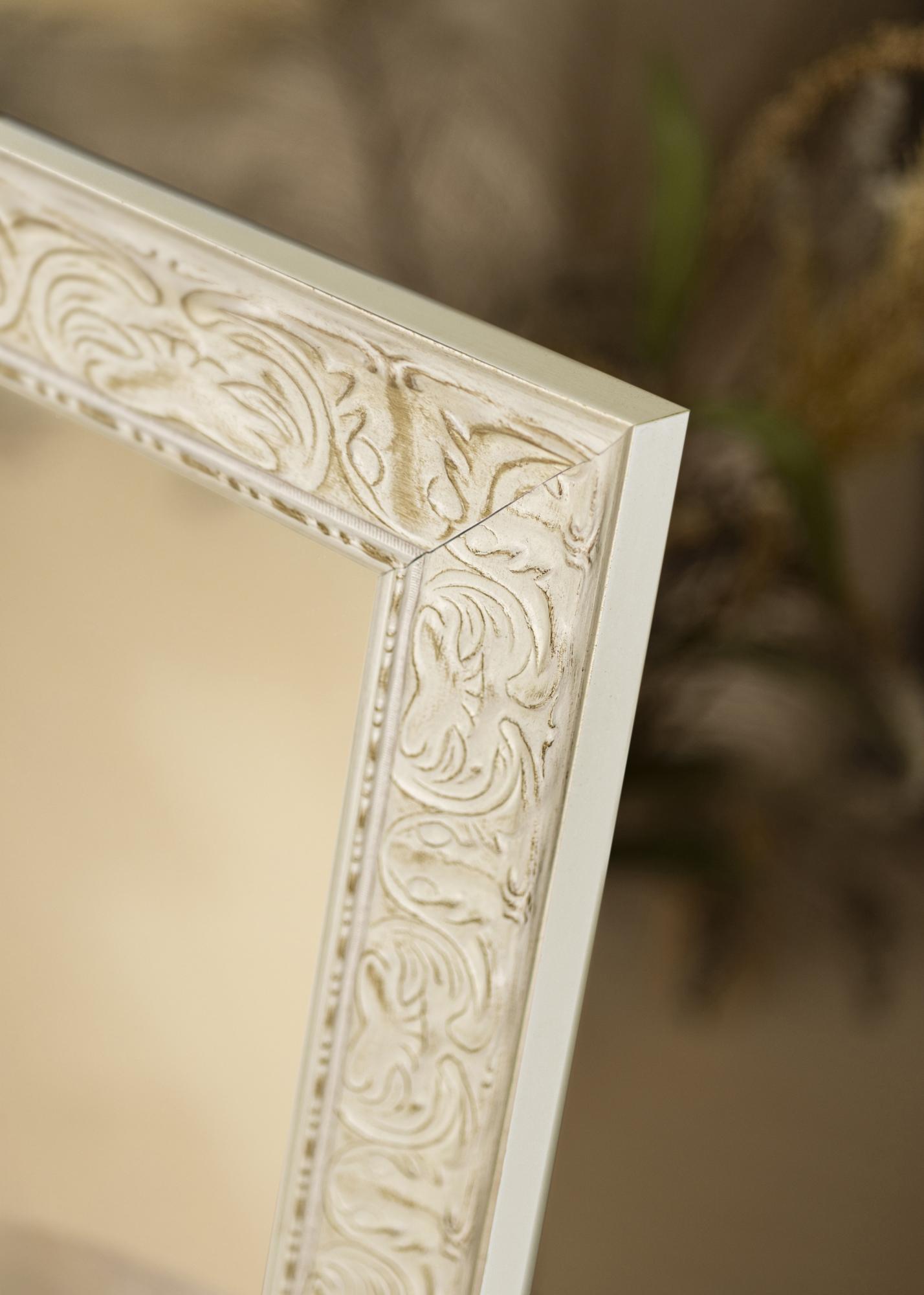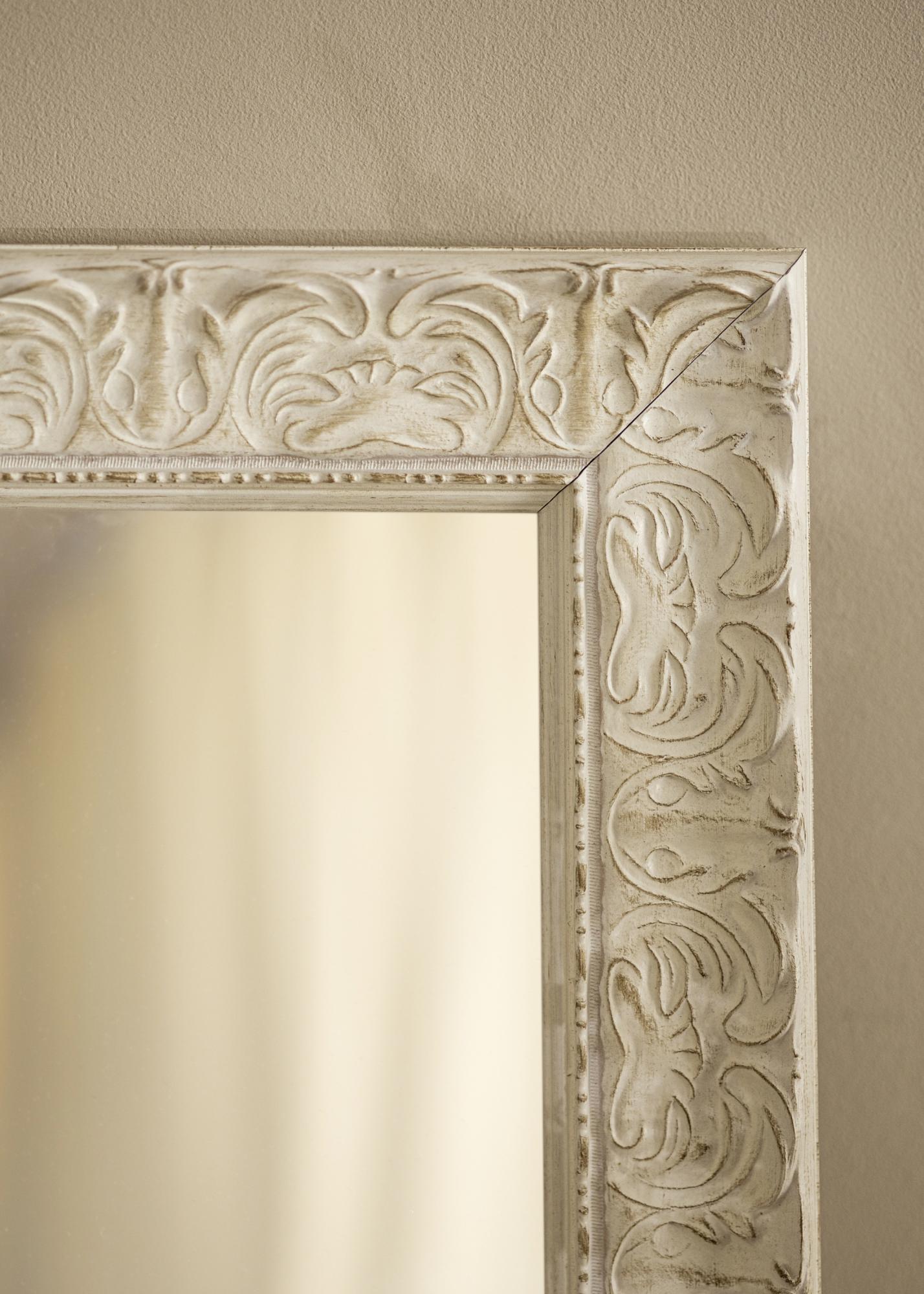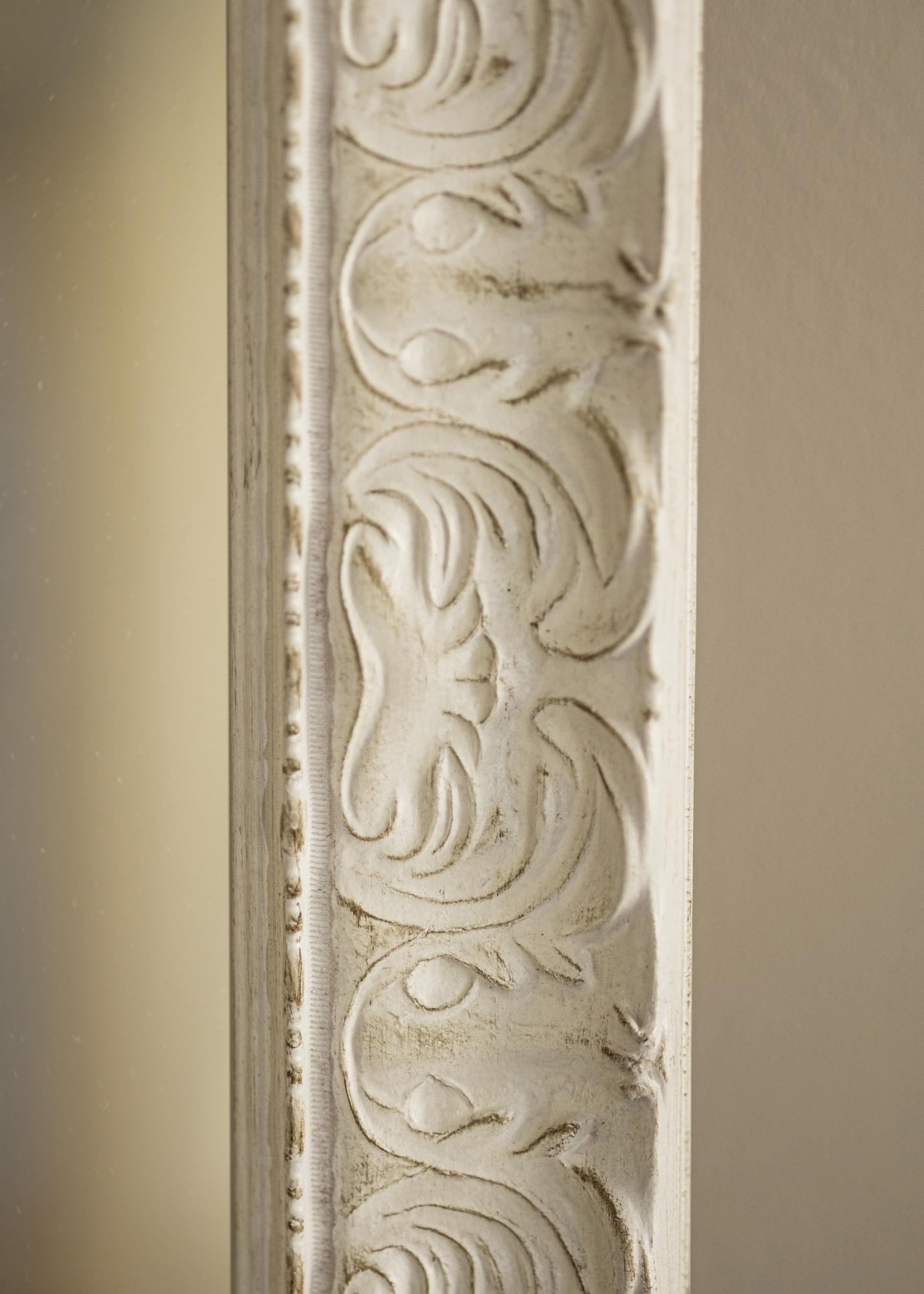 Peilin antiikkivalkoinen viimeistely koristeellisella reliefillä ja hienostuneesti kuluneella pinnalla antaa sille ainutlaatuisen luonteen. Koristeelliset yksityiskohdat vahvistavat sen klassista ilmettä ja tekevät siitä huoneen katseenvangitsijan. Olipa sisustuksesi moderni tai perinteinen, tämä peili sulautuu saumattomasti ja tuo samalla jotain erityistä.