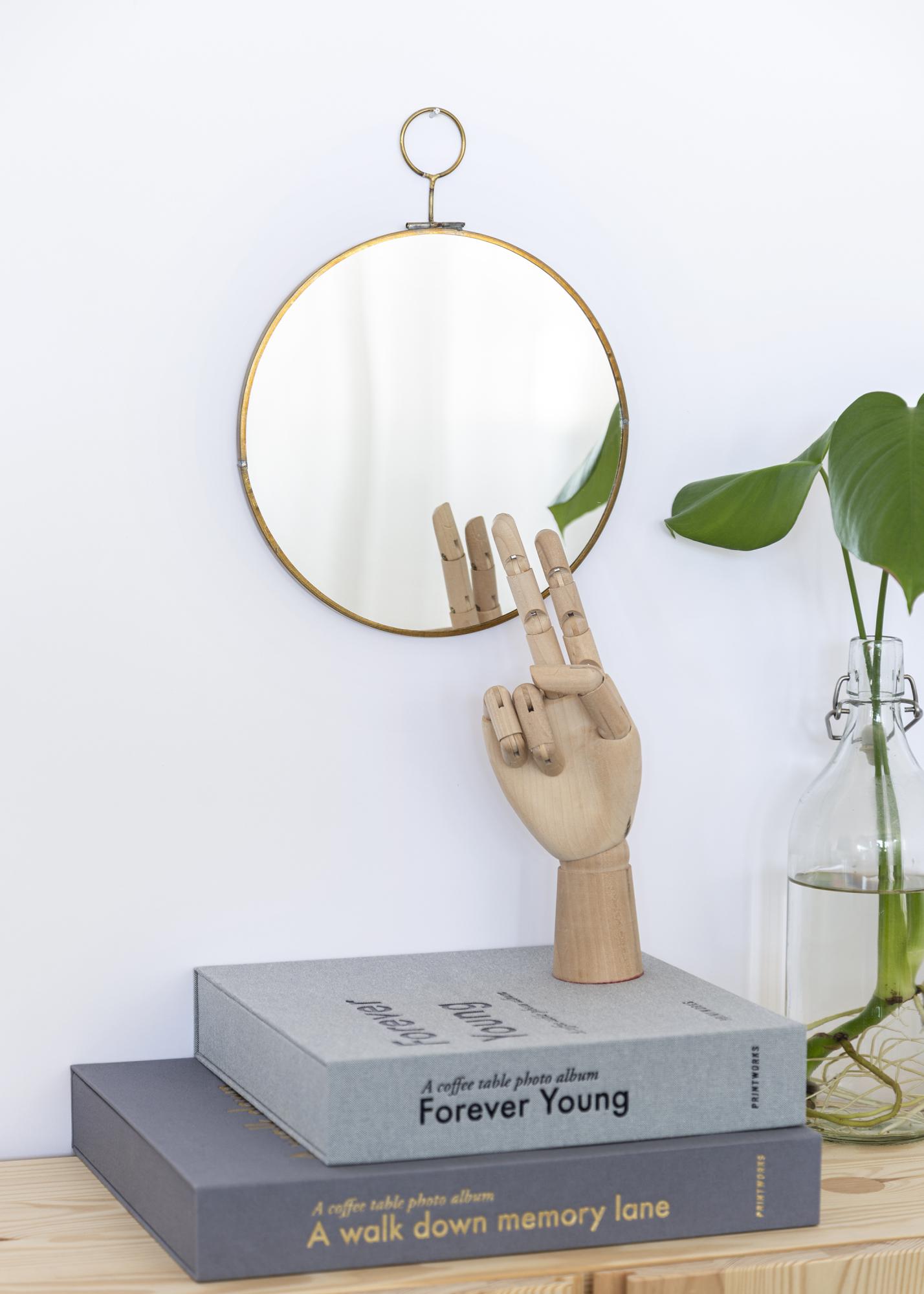 Tämä pyöreä peili on hillitty ja oikein käytännöllinen. Peiliä kehystää ohut tyylikäs messingin värinen reuna. Peilin yläosassa on pieni ympyrä joka on koristeellinen yksityiskohta ja sen lisäksi toimii myös helppona ja kätevänä ripustuksena.