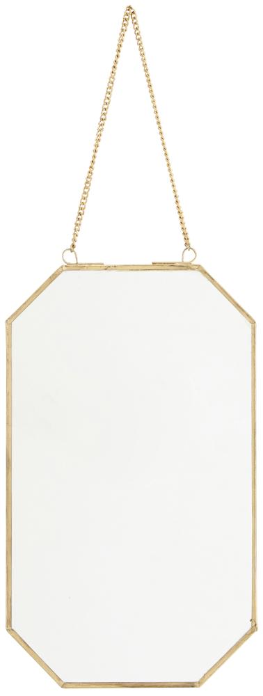 Kahdeksankulmainen peili Madam Stoltzilta, tyylipuhtaalla messinkikehyksellä. Peili ripustetaan ketjulla - myöskin messinkiä, mikä tekee siitä elegantin ja erityisen sopivan olohuoneeseen tai makuuhuoneeseen. Seinäpeilin mitat ovat 15x25 cm. Pieni koko tekee seinäpeilistä superhienon yhdistettäväksi muiden peilimallien kanssa.
