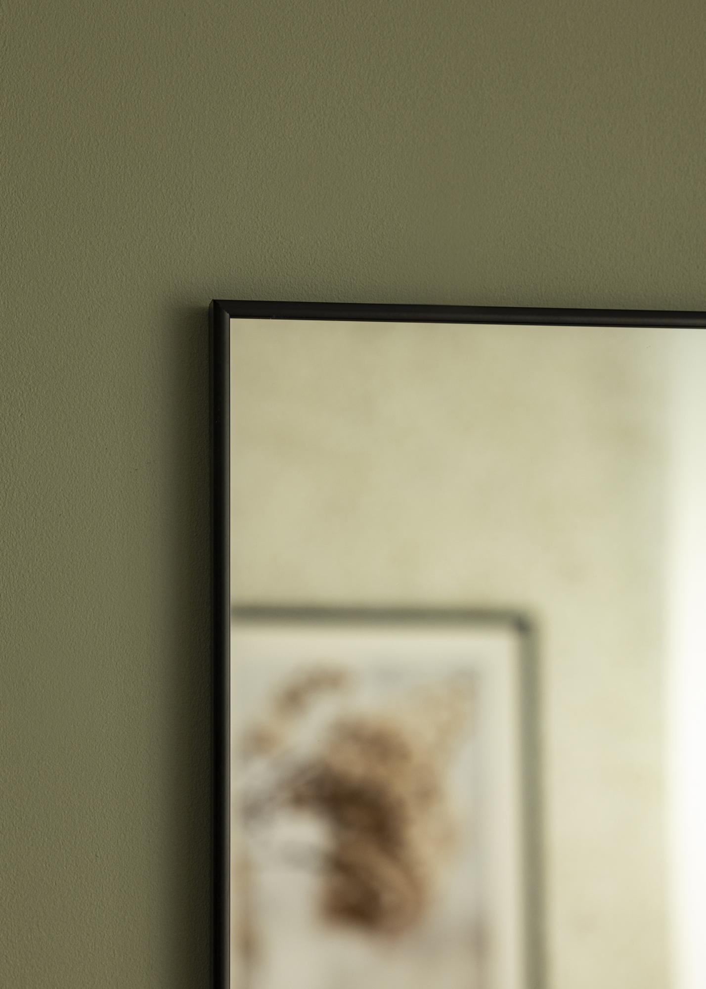 Tämä peili on kehystetty hienostuneella mustalla alumiinikehyksellä, joka lisää modernin kosketuksen sisustukseesi. Se on paitsi käytännöllinen esine myös koristeellinen yksityiskohta, joka täydentää sekä klassisia että moderneja tyylejä.