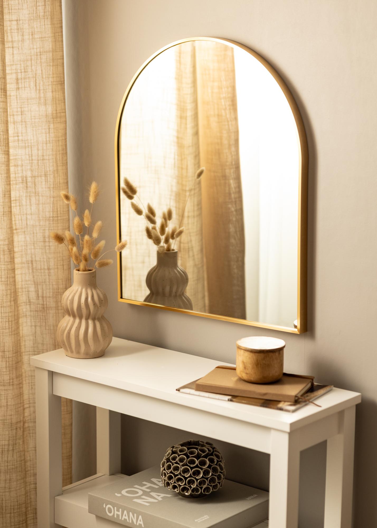 Tämä on moderni seinäpeili, jota voi käyttää kaikissa huoneissa. Saat peilistä trendikkään sisustusyksityiskohdan makuuhuoneeseen tai olohuoneeseen. Tai voit käyttää sitä kylpyhuoneen tai eteisen peilinä, kun haluat peilata itseäsi kunnolla valmistautuessasi päivää varten. Peilin kullanvärinen, 28 mm syvä metallinen kehys luo peilille erityisen hienostuneen ilmeen. Tyylikäs kaareva muoto vahvistaa ylellisyyden tuntua vielä lisää.