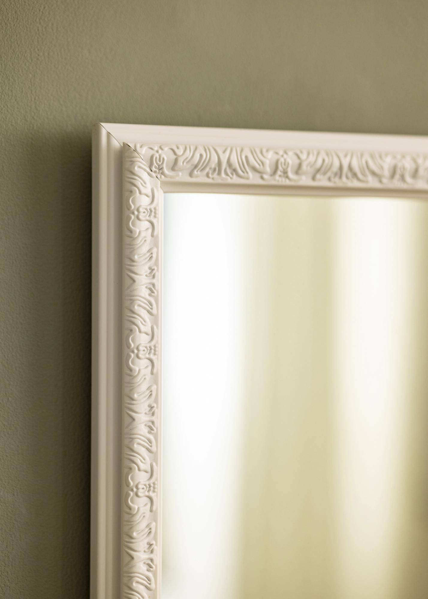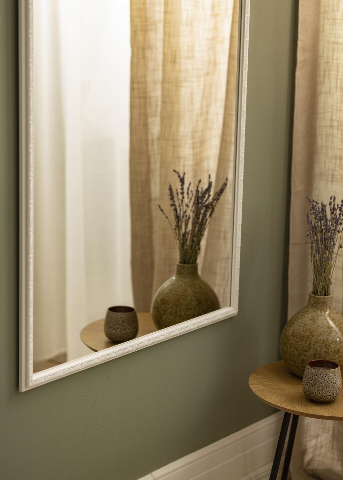 Tämä seinäpeili on tyylipuhdas sisustusyksityiskohta, joka heijastaa kauniisti valoa huoneen kaikista valonlähteistä. Valkoinen kehyslista antaa valoisan ja raikkaan vaikutelman, jota kehyksen koristeellinen profiili ja kaunis kuviointi vielä täydentävät.