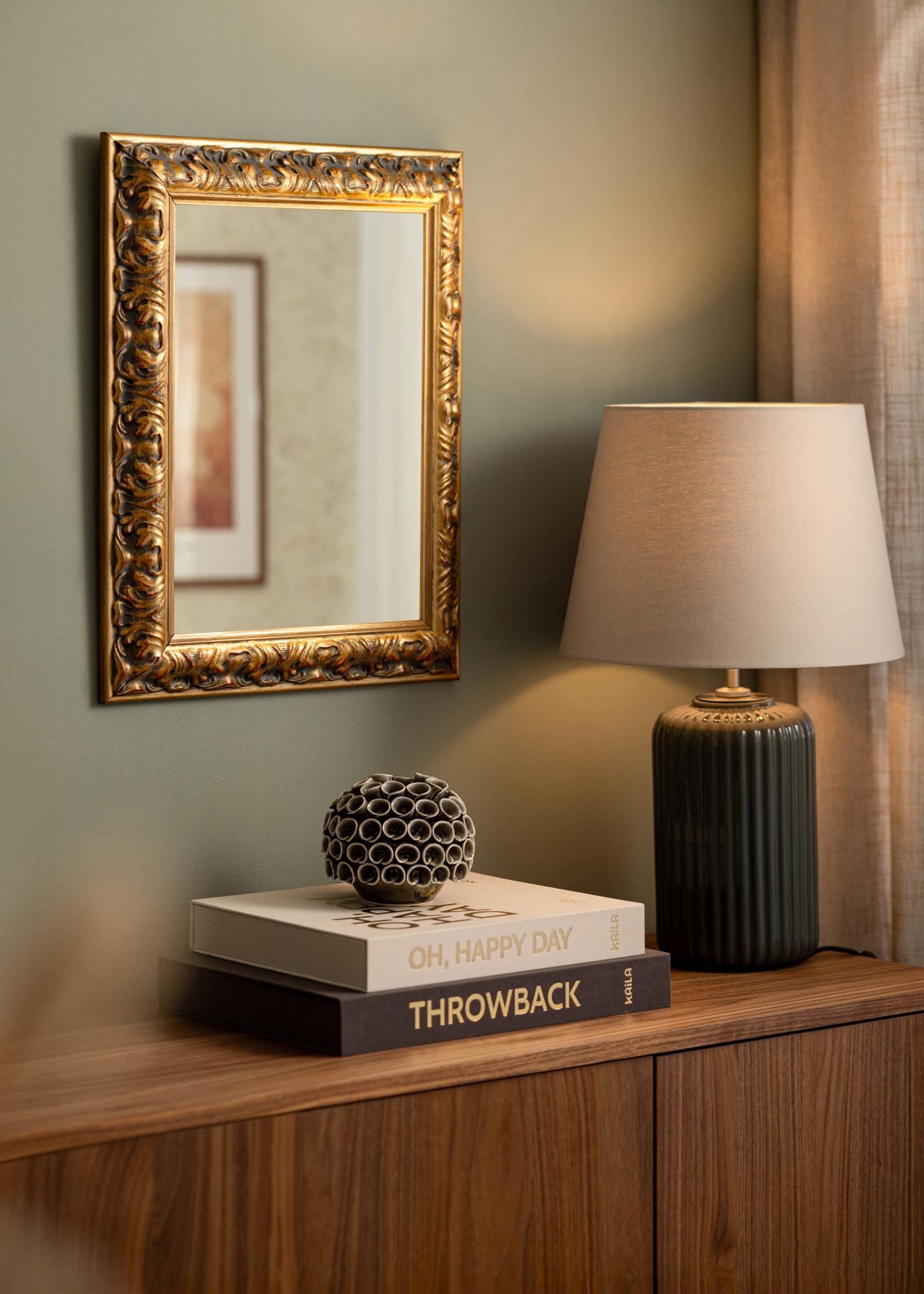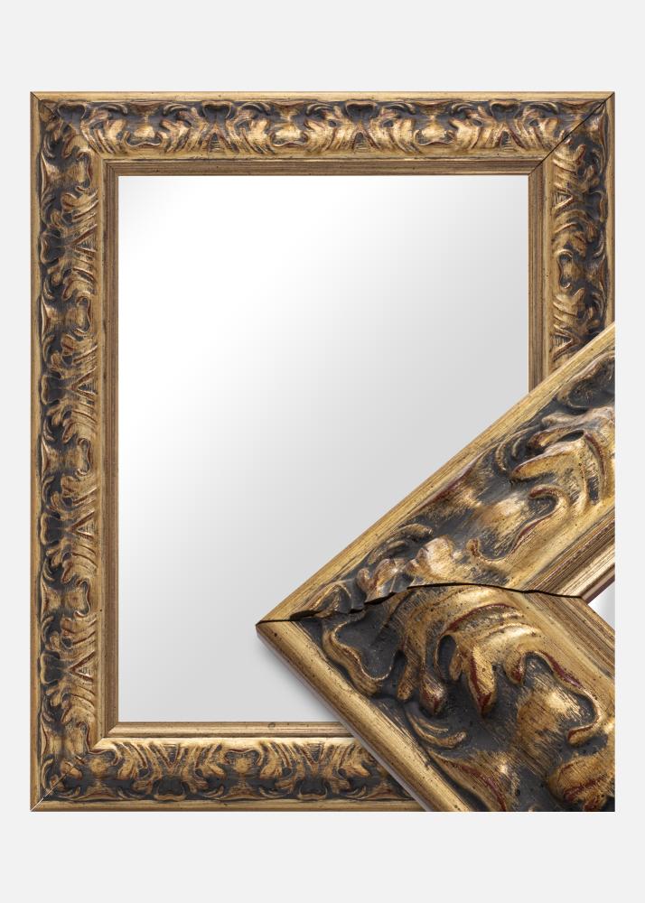 Peili Odin Kulta/Punainen on elegantti ja tyylikäs peili, joka valmistetaan omien mittojesi mukaan. Koristeellisen kultakehyksen ja antiikkipatinoituneen ilmeen ansiosta siitä tulee huomiota herättävä lisä mihin tahansa huoneeseen. Kehys, joka on 64 mm leveä ja 38,5 mm syvä, on valmistettu männystä ja koristeltu barokkityylisillä yksityiskohdilla. Kohokuvioidut mallit antavat peilille ainutlaatuisen luonteen, jota korostaa hienovarainen kontrasti kullan ja tummien sävyjen välillä.