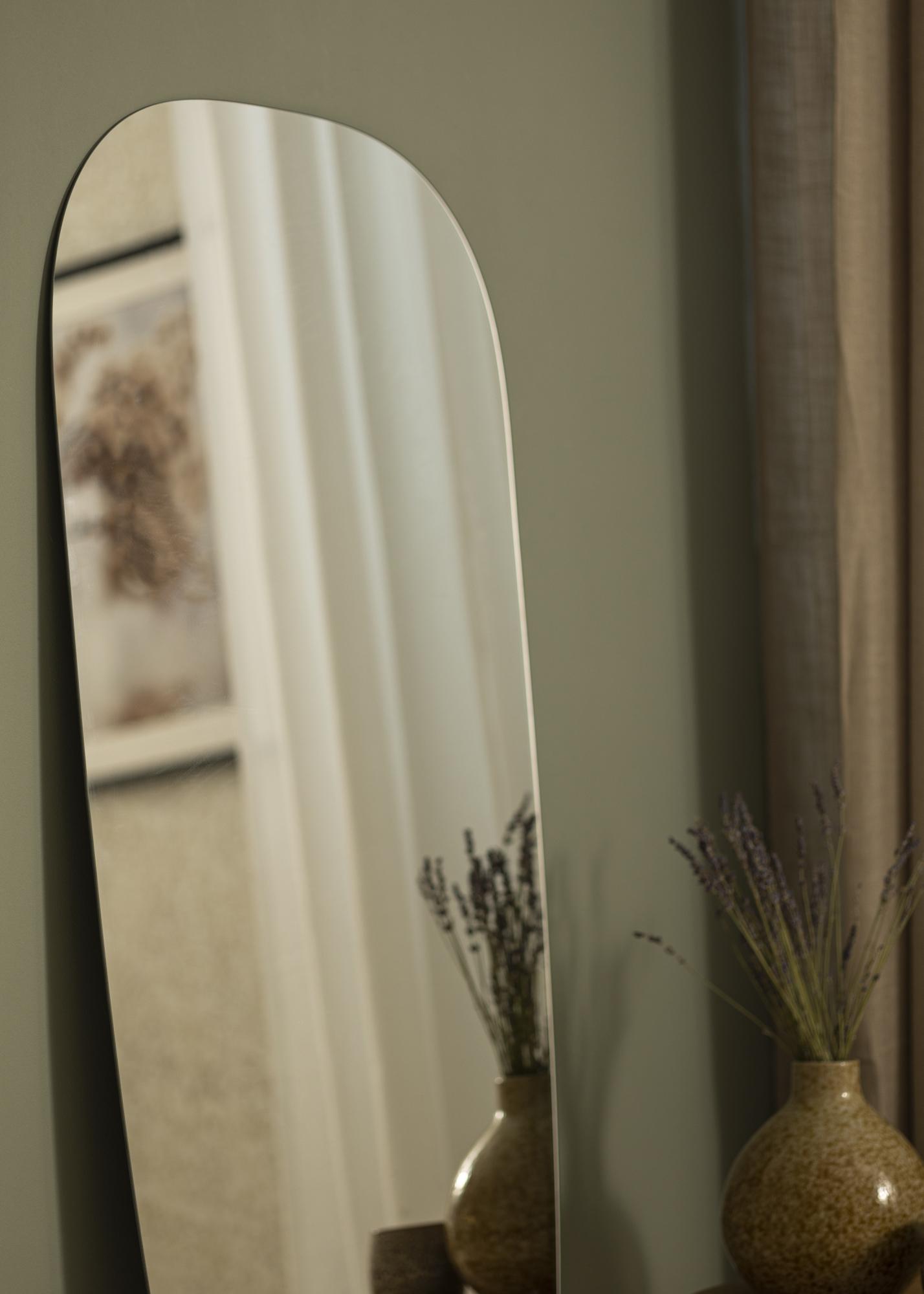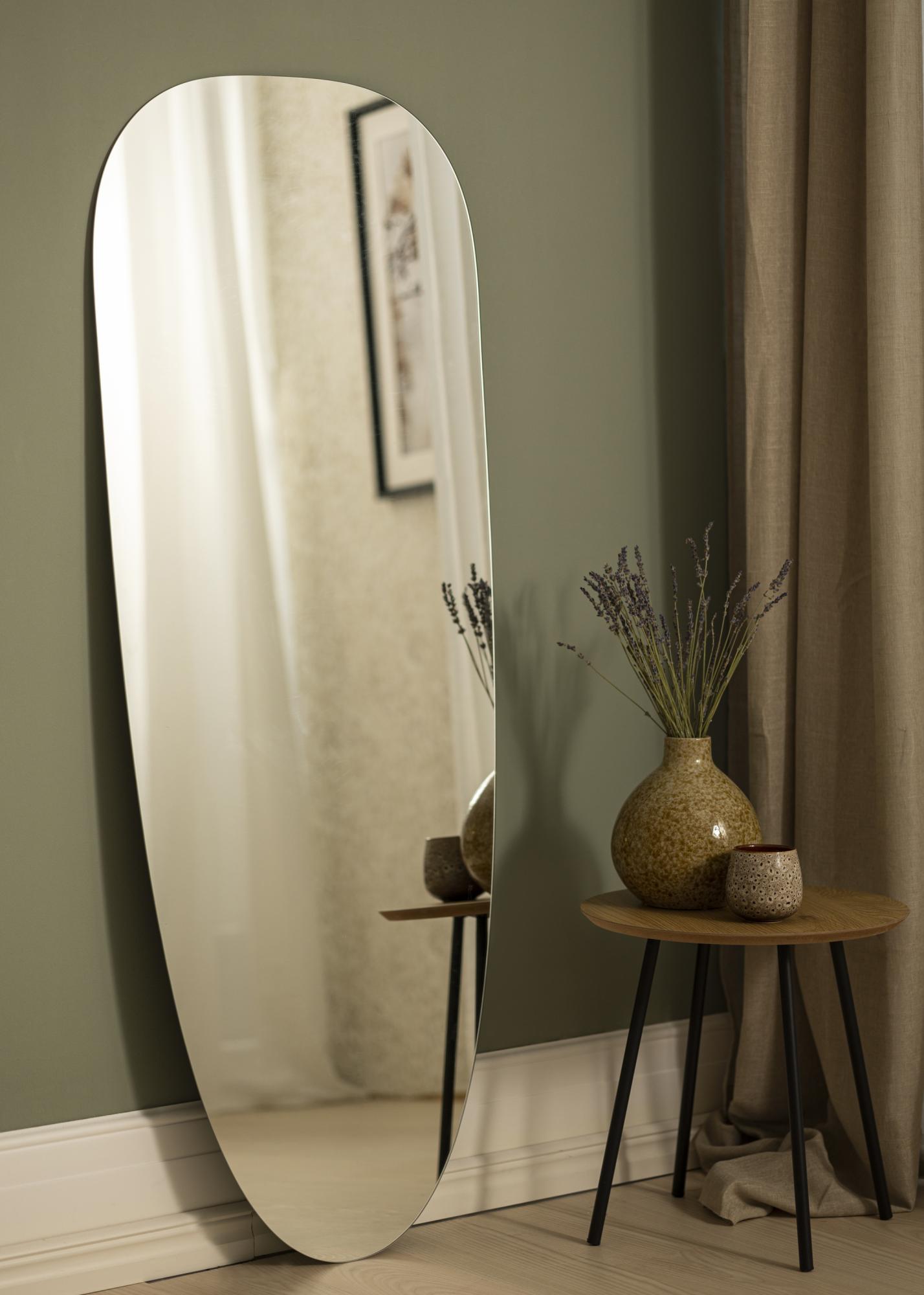 Tämä peili on suunniteltu roikkumaan pystyasennossa, mikä tekee siitä ihanteellisen kapeampiin seiniin tai tiloihin, joissa vaakasuuntainen tila on rajallista. Sen liukuva ja orgaaninen muoto luo pehmeän ja kutsuvan ilmapiirin huoneeseen, samalla kun se toimii käytännöllisenä ja koristeellisena elementtinä. Peilin muotoilu on huolellisesti harkittu sulautumaan erilaisiin sisustustyyleihin, minimalismista perinteisempään.