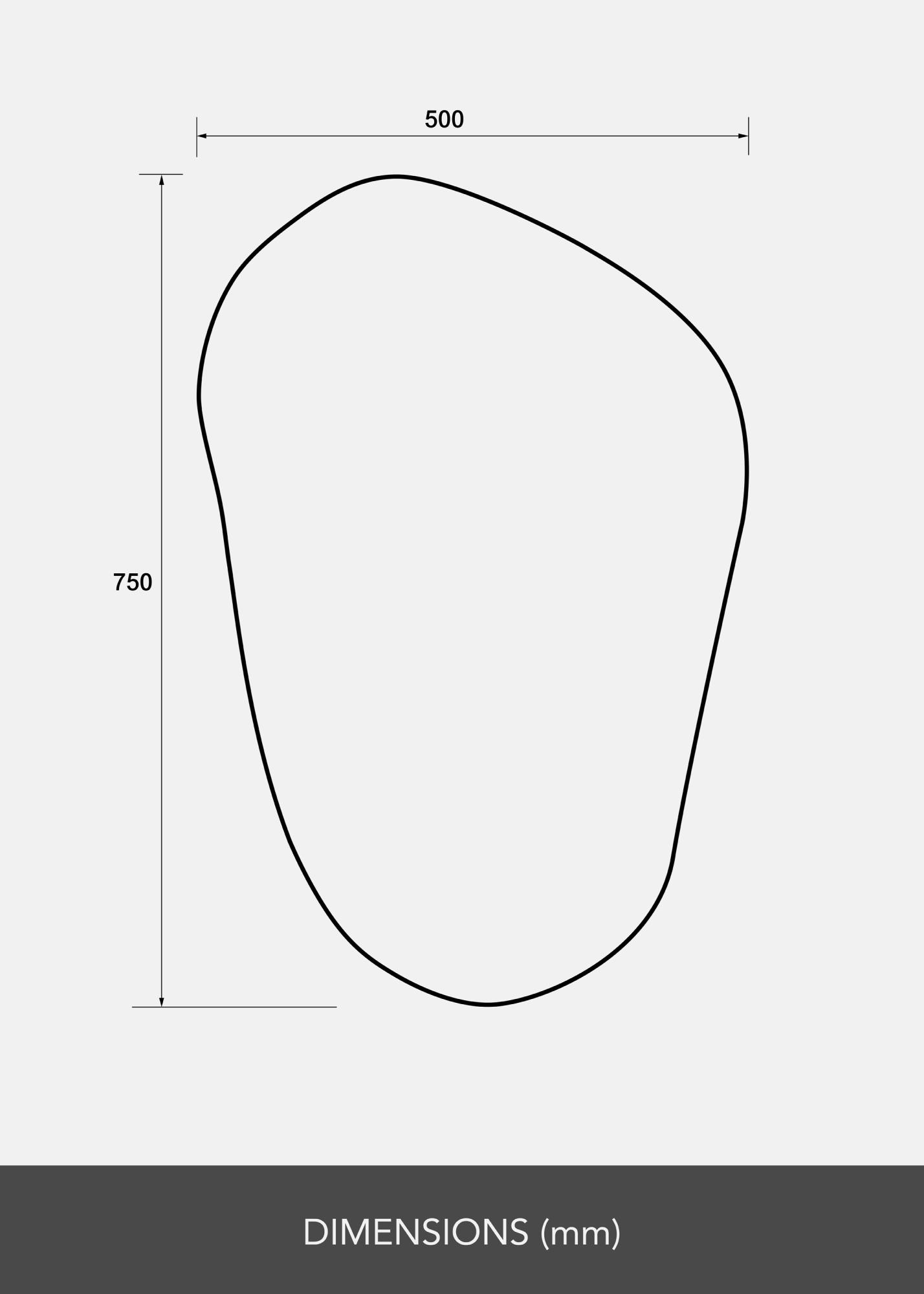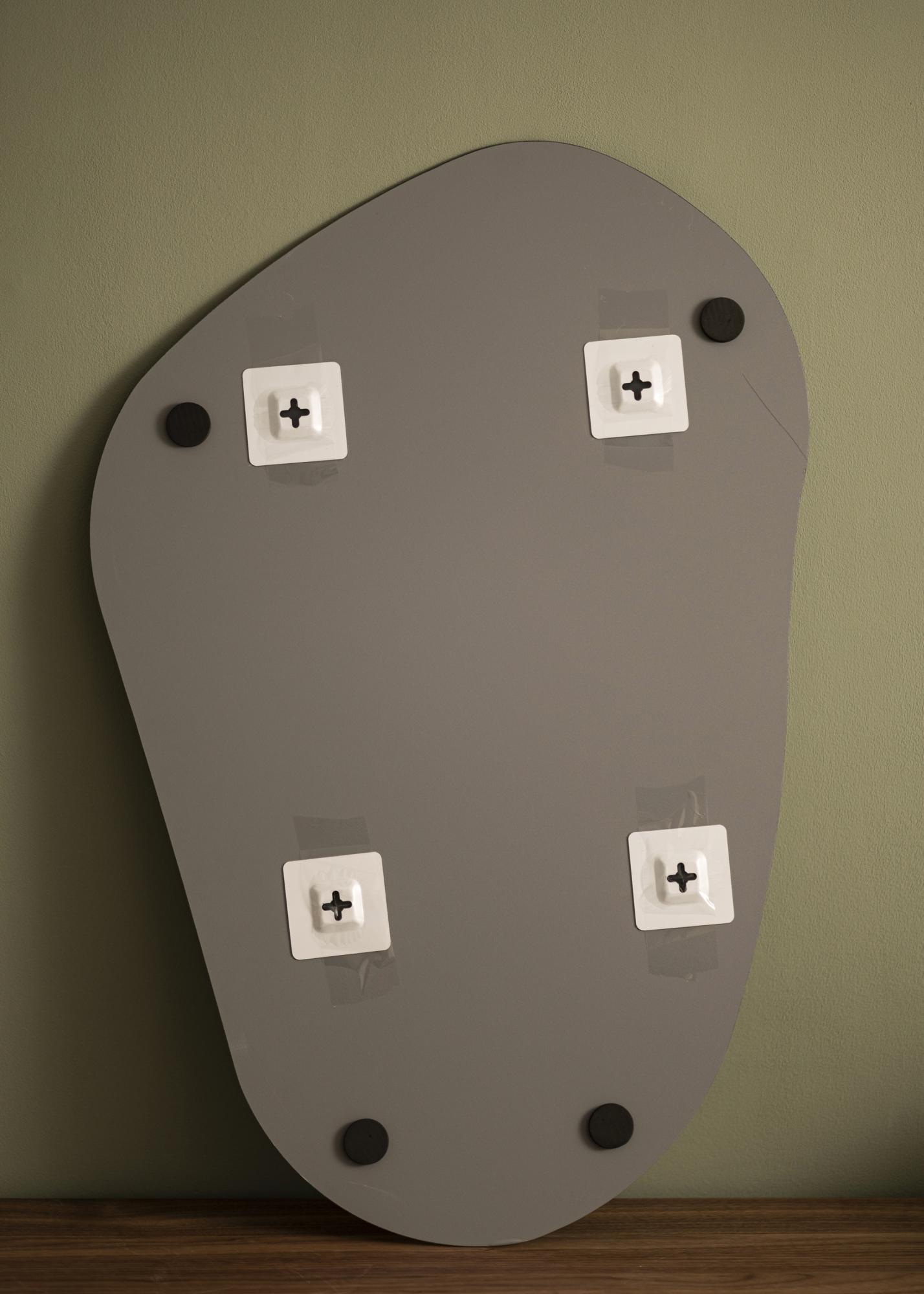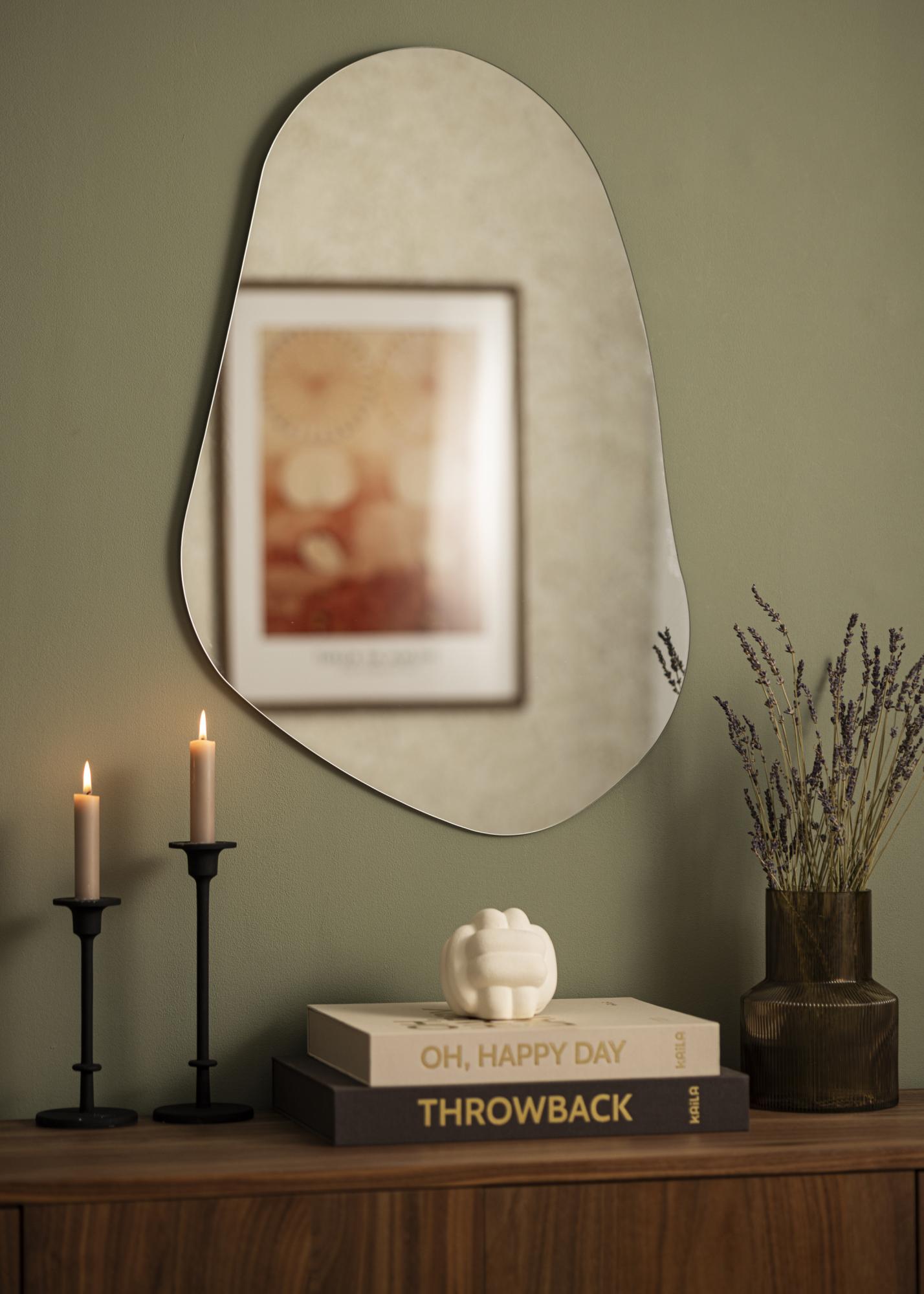 Tämä Peili on orgaanisen, epäsymmetrisen ja pehmeästi aaltoilevan muotoinen, mikä antaa sille modernin ja taiteellisen ilmeen. Pyöristetyt kaaret ja suorien reunojen puute tuovat mieleen vapaalla kädellä piirretyn siluetin, aivan kuin luonnollisesti muotoutunut kivi tai venytetty pisaran muoto.