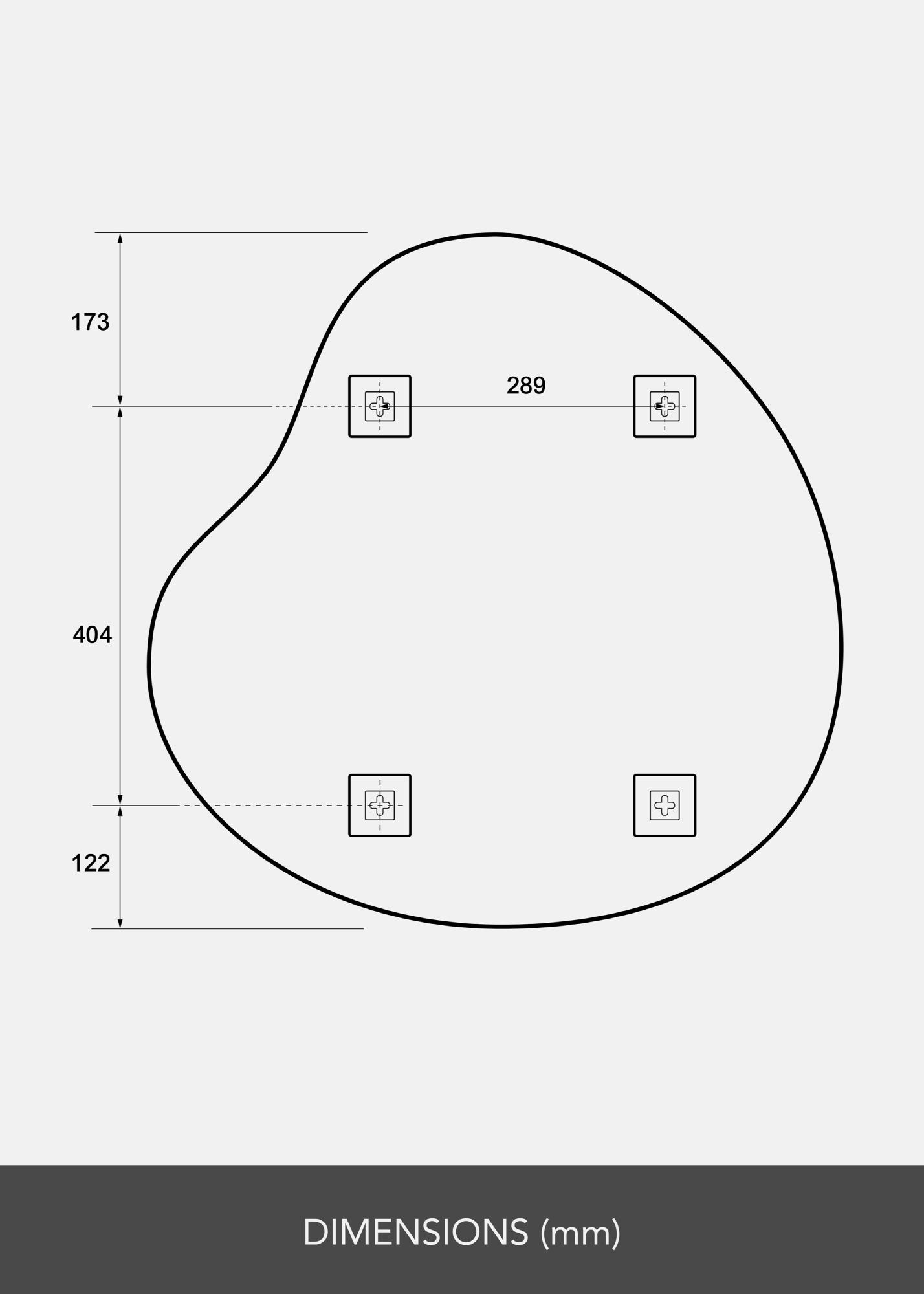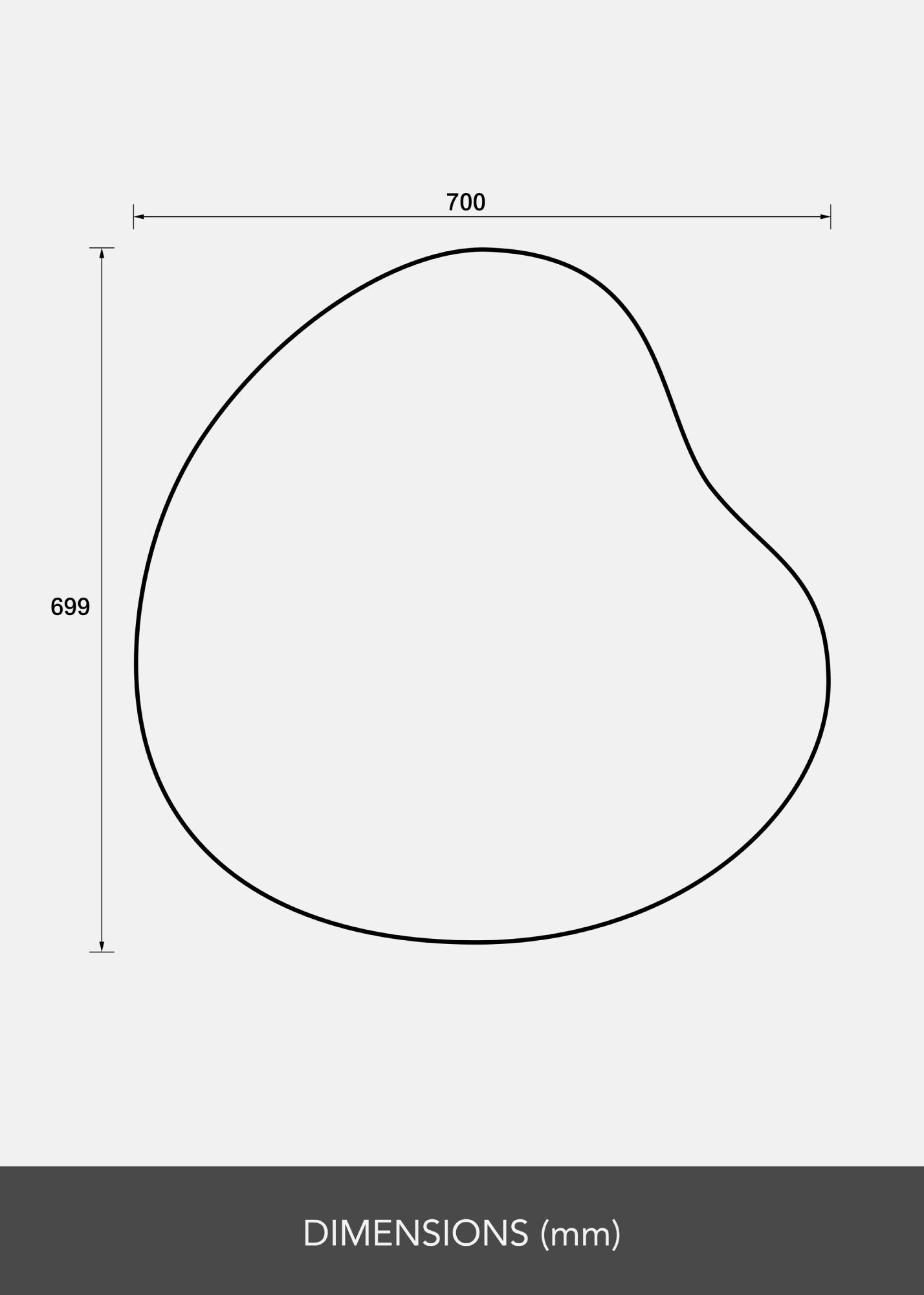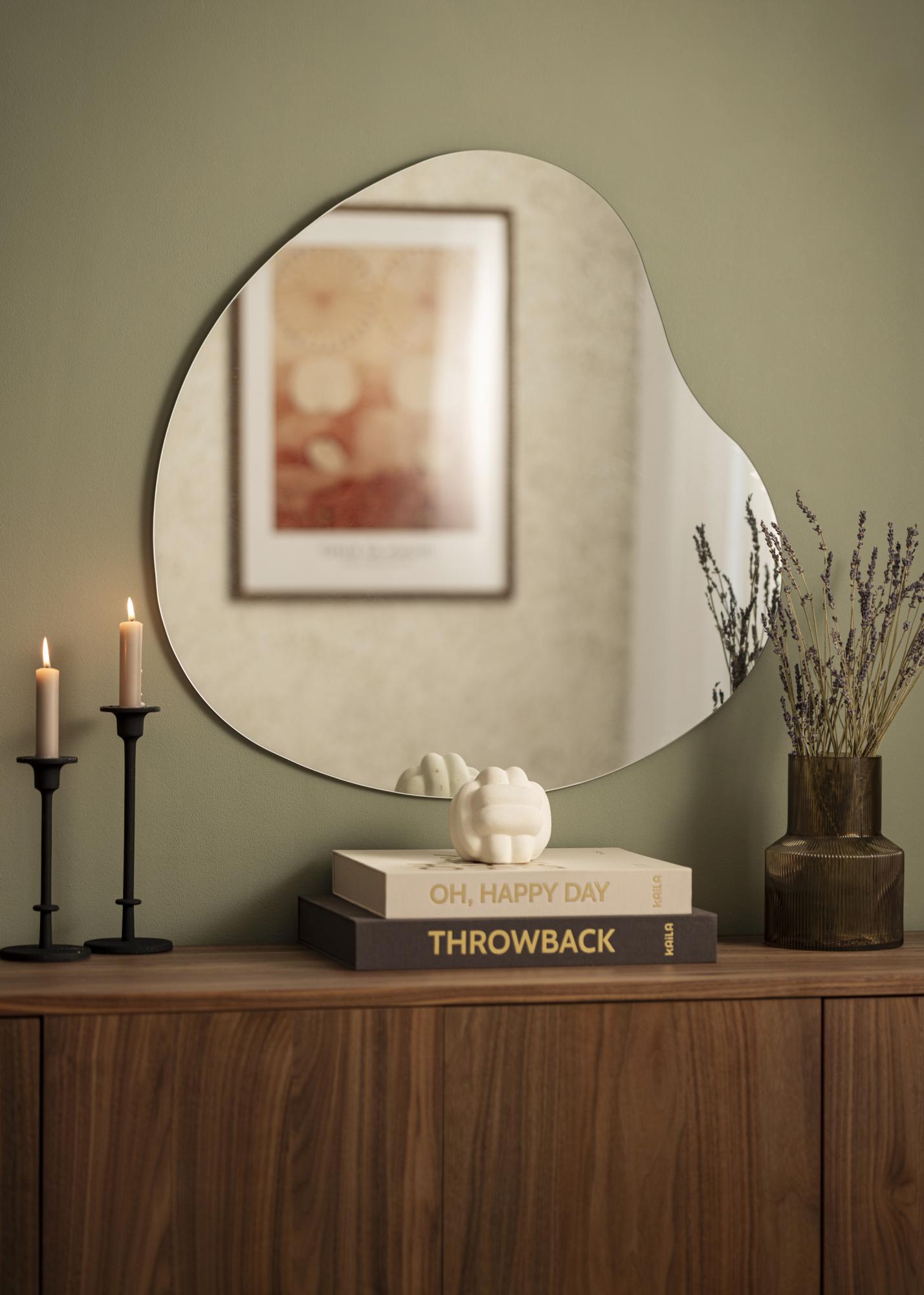 Peilillä on pehmeästi muotoiltu, asymmetrinen muoto, joka kaartuu sulavasti ja antaa vaikutelman liikkeestä ja pehmeydestä. Tämä muotoilu tekee peilistä taiteellisen yksityiskohdan seinällä, samalla säilyttäen sen käytännöllisen funktion.