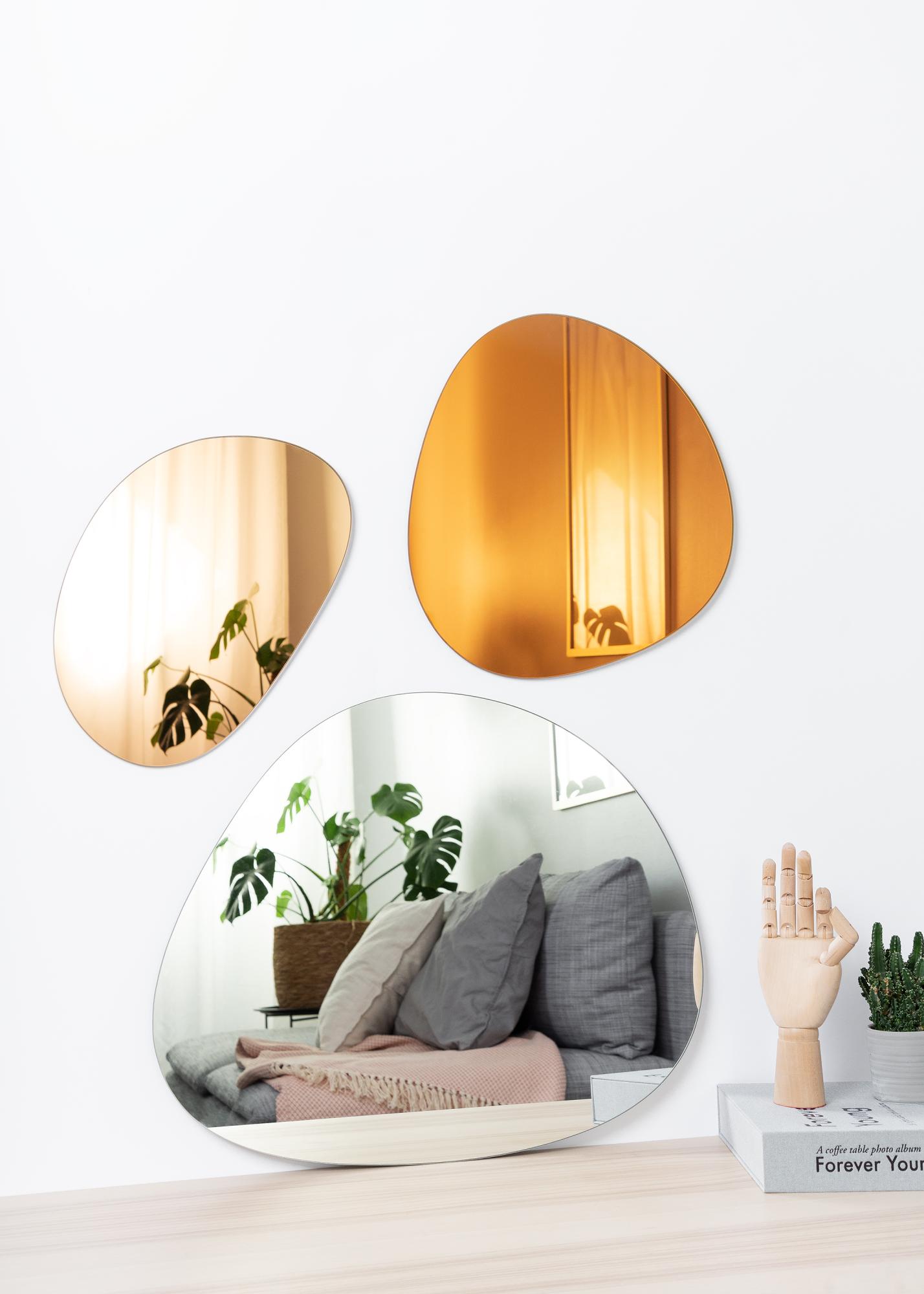 Tämä on hauska peilisetti kaikille, jotka haluavat sekoittaa tyylejä. Se koostuu kolmesta peilistä, joista yksi on oranssi, yksi ruusukultainen ja yksi värjäämätöntä lasia. Suurin peili on värjäämätöntä lasia, ja sen koko on 53,3x46 cm. Keskikokoinen peili on oranssi ja kooltaan 36,5x37,5 cm, ja pienin, jonka koko on 35x23,2 cm, on ruusukultainen.