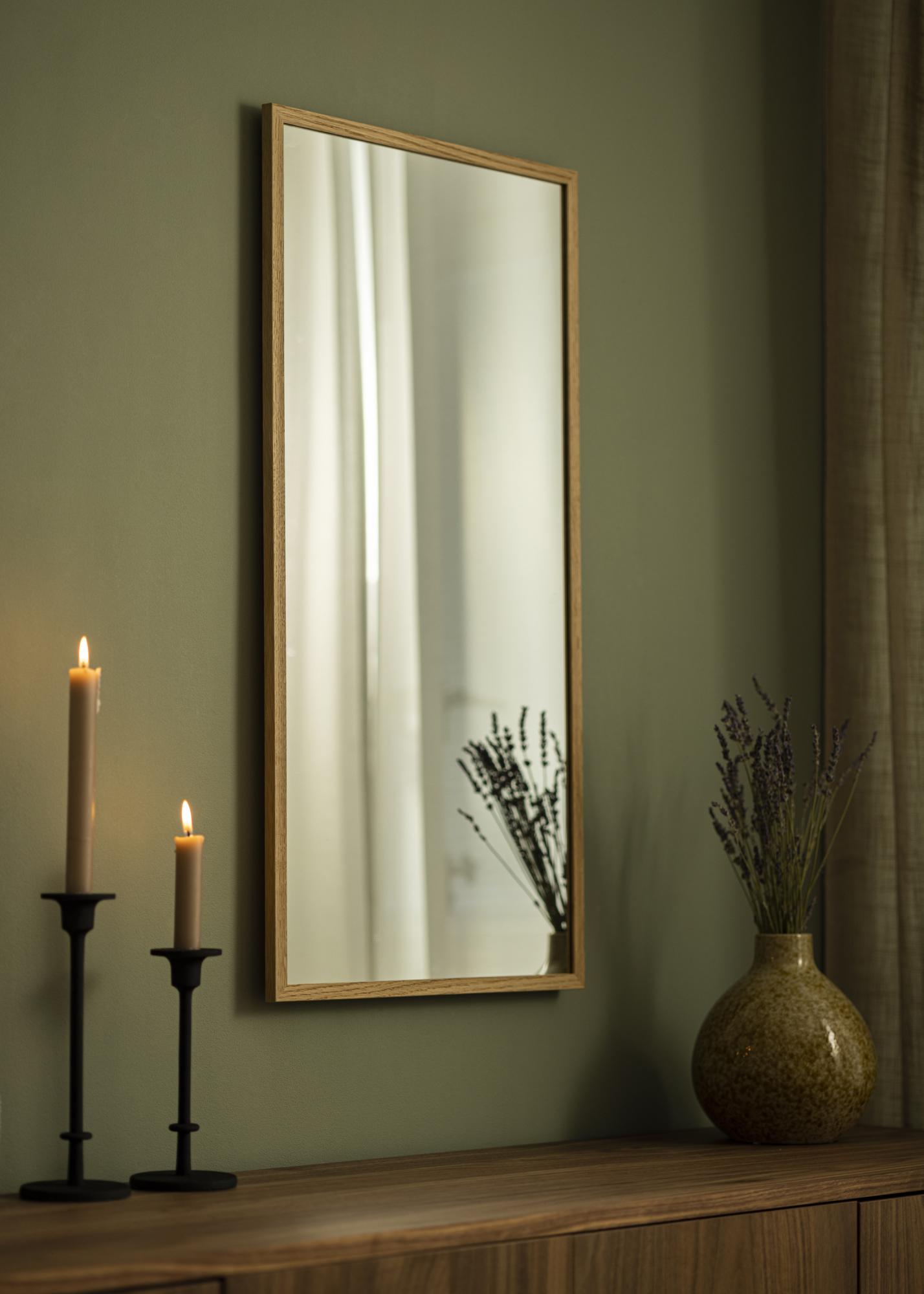 Tämä suorakulmainen peili on kehystetty massiiviseen tammipuuhun, mikä luo lämpimän ja orgaanisen tunnelman sisustukseesi. Luonnonmukainen puukehys ei vain ole kaunis katsella, vaan se myös edistää kestävää ja ajatonta muotoilua, joka kestää vuosia.