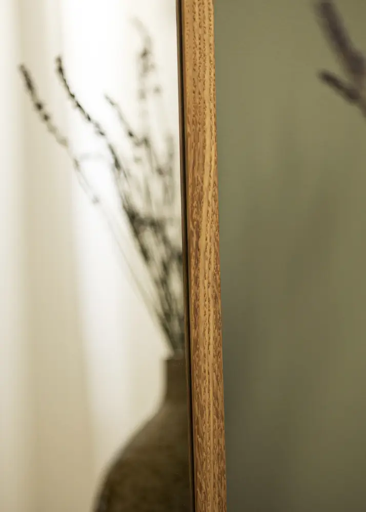 Löydä elegantti yksinkertaisuus 48x133 cm pystysuorasta peilistämme, täydellinen yhdistelmä tyyliä ja toiminnallisuutta. Sen suorakaiteen muoto ja korkea profiili tekevät siitä kätevän ja koristeellisen lisän kotiisi. Tyylikäs aito tamminen kehys välittää luonnon ja lämmön tunnetta, mikä tekee siitä ideaalin valinnan kaikille, jotka arvostavat kestäviä materiaaleja ja ajatonta suunnittelua.
