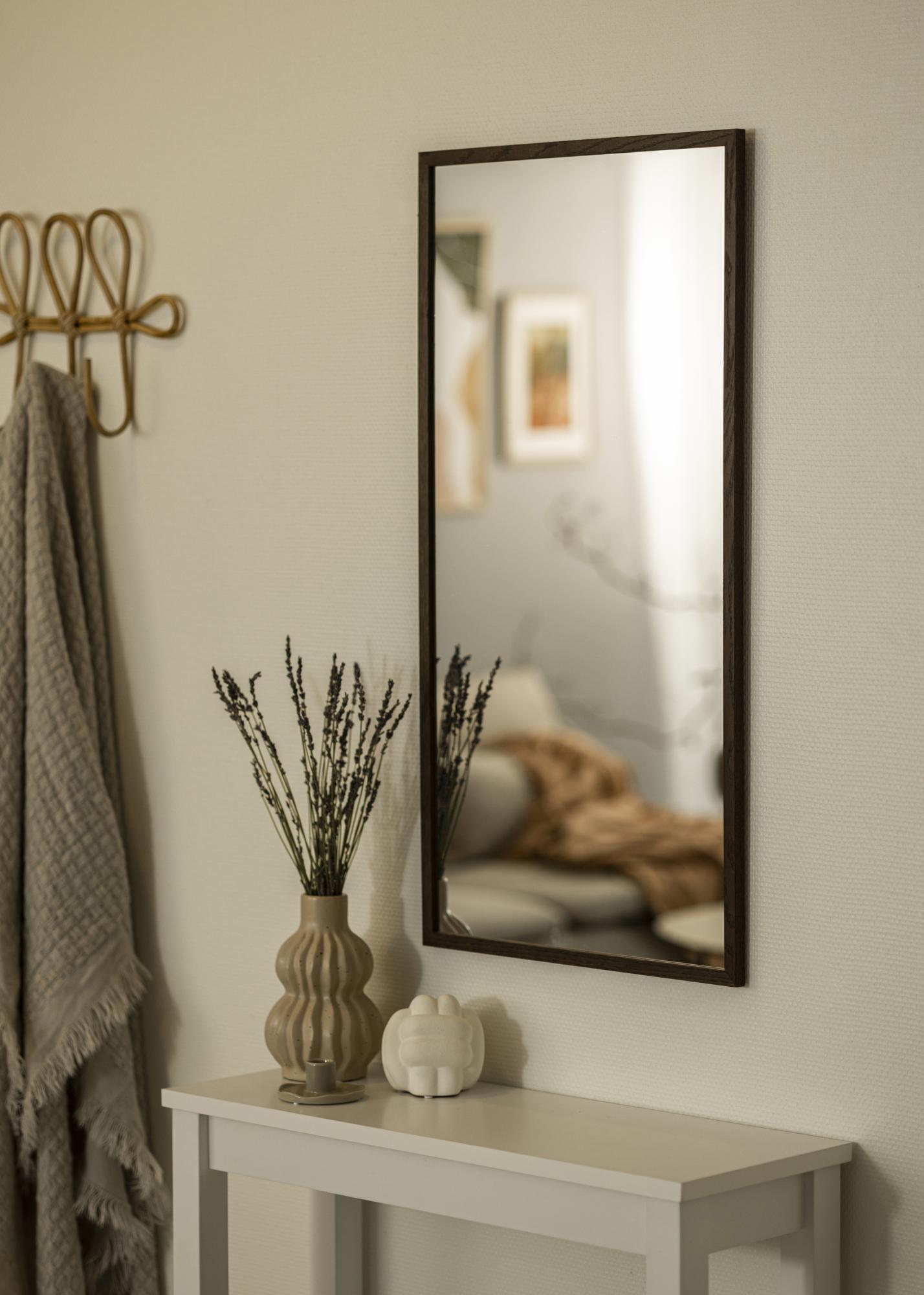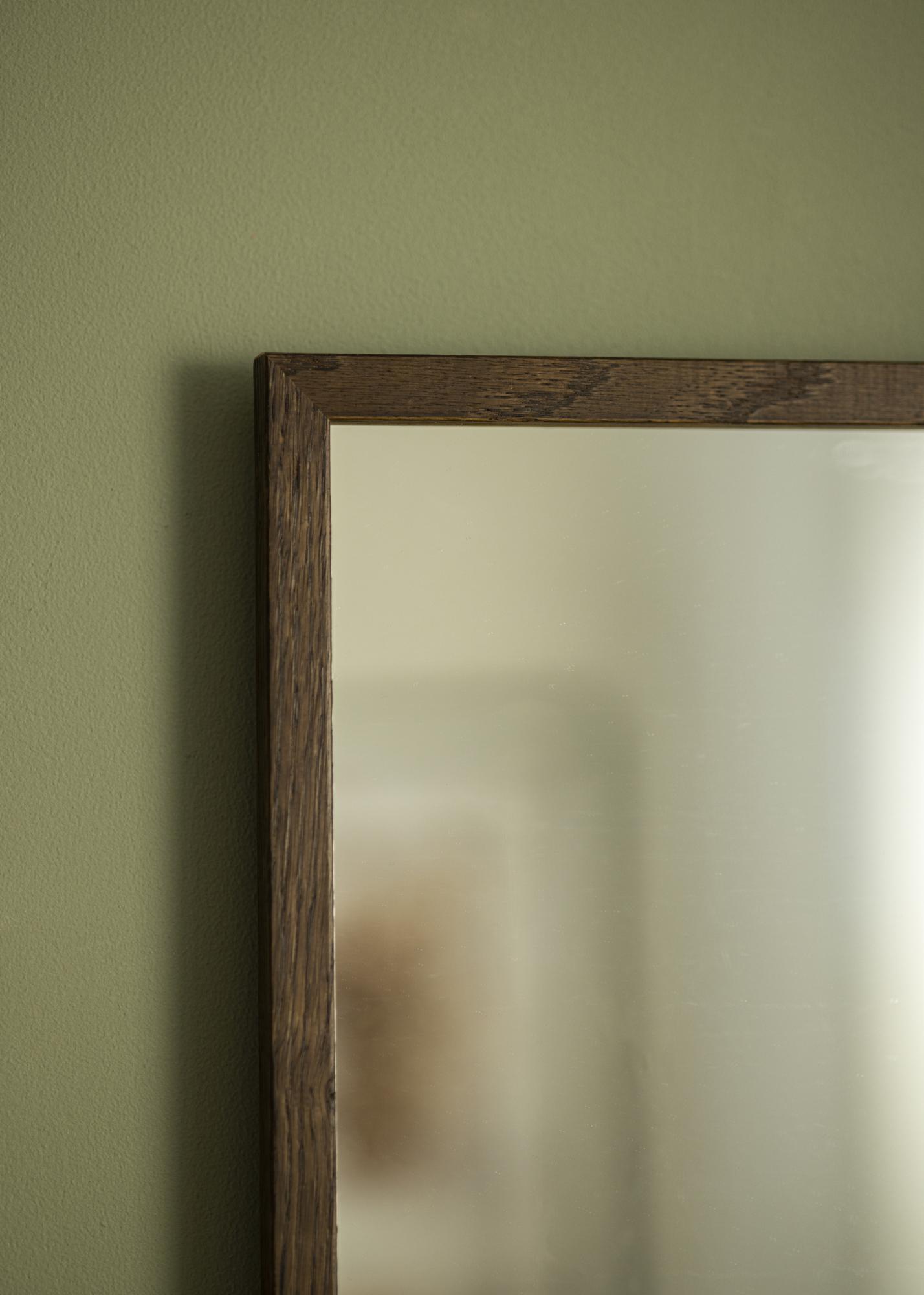 Löydä tyylikäs eleganssi suorakulmaisella peilillämme, täydellisesti suunniteltu rikastuttamaan kotiasi klassisen kauneuden kosketuksella. Sen anteliaat mitat 46x86 cm tekevät tästä peilistä paitsi käytännöllisen, myös silmäänpistävän koristeellisen yksityiskohdan. Sen paksu todellisesta tammenpuusta valmistettu kehys on syvän tummanruskea, mikä antaa välittömän tunteen vankasta eleganssista ja ajattomasta hurmauksesta mihin tahansa huoneeseen.
