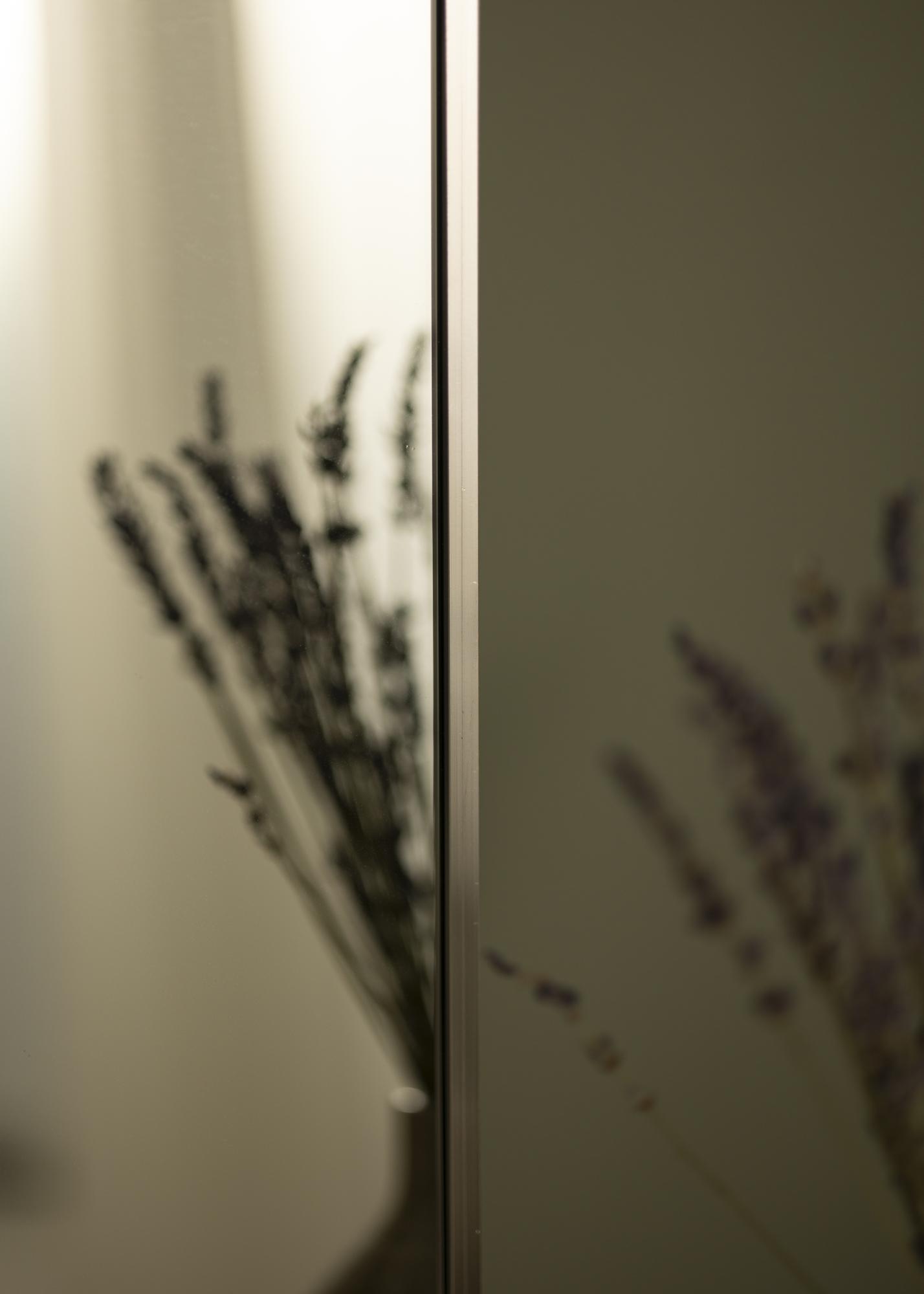 Tämä peili on koristeltu ohuella, hopeanvärisellä alumiinikehyksellä, joka lisää ripauksen hienostuneisuutta sisustukseesi. Suorakulmainen muoto on sekä ajaton että moderni ja sopii monenlaiseen sisustustyyliin. Peilin minimalistinen muotoilu saa sen sulautumaan huoneeseen samalla kun se erottuu tyylikkäänä yksityiskohtana.