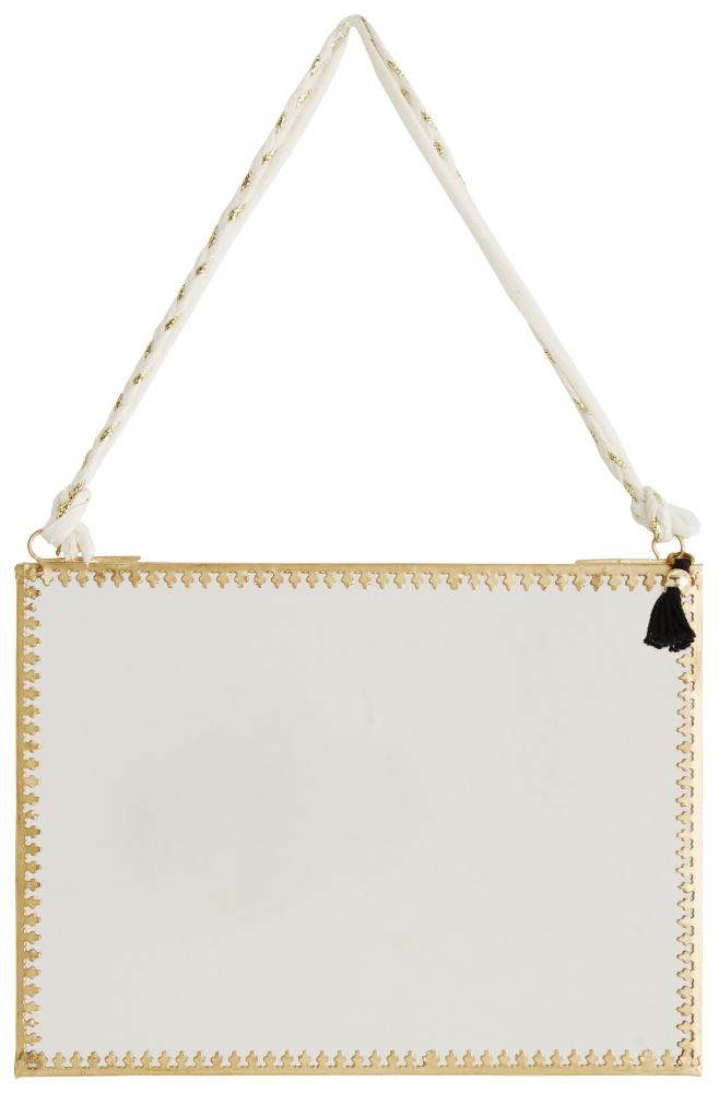 Kaunis Madam Stoltzin peili, josta tulee hieno yksityiskohta kaikkiin kodin huoneisiin. Peilissä on elegantisti muotoiltu kultakehys ja koristeellinen tupsu yhdessä kulmassa. Ripustukseen käytettävä nauha on puuvillaa, mikä antaa peilille boheemia tuntua. Seinäpeilin mitat ovat 20x15 cm ja pieni koko tekee siitä superhienon yhdistettäväksi muihin peilimalleihin. Peili on käsintehty, joten jokainen yksittäinen peili voi olla hieman erilainen.
