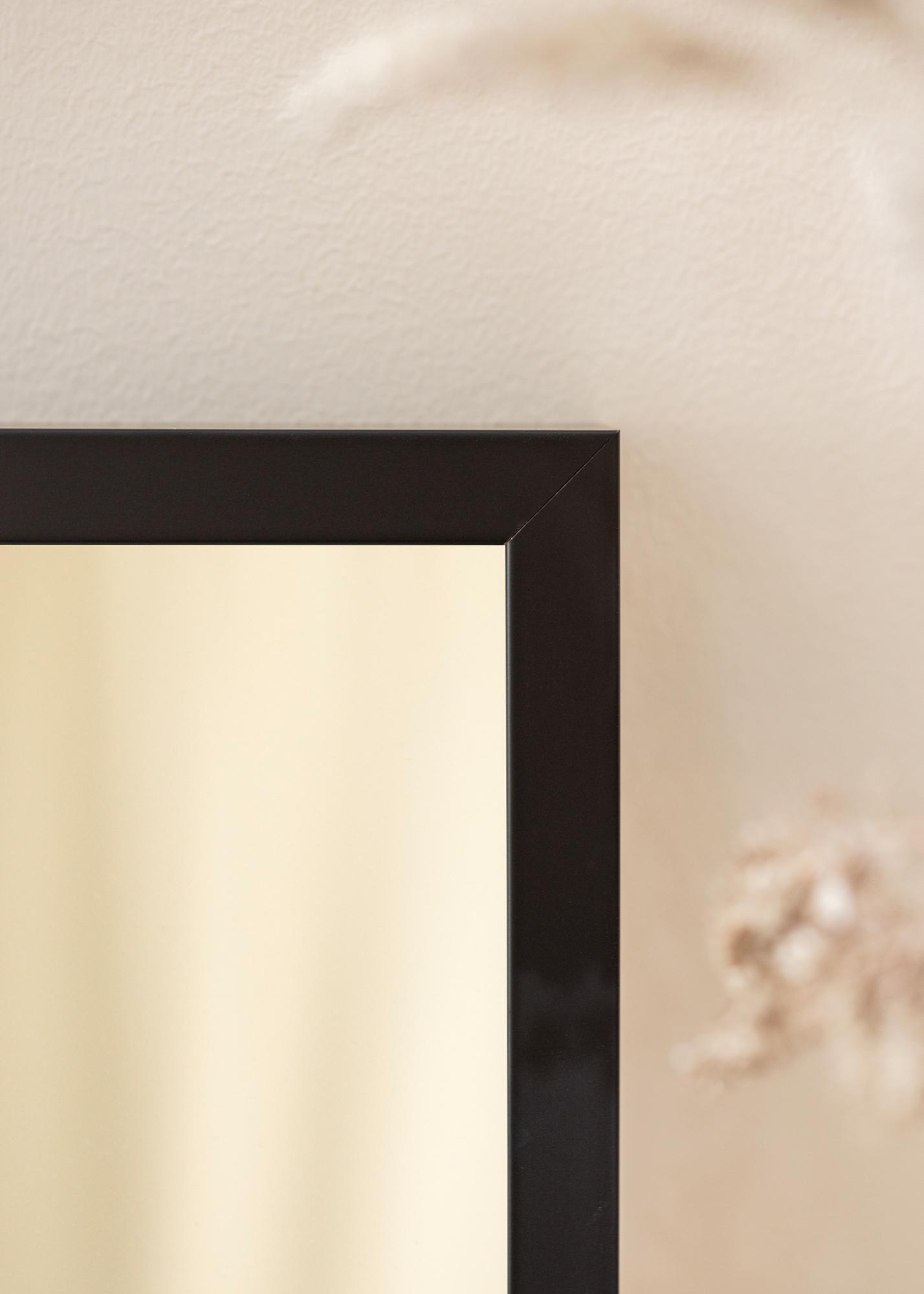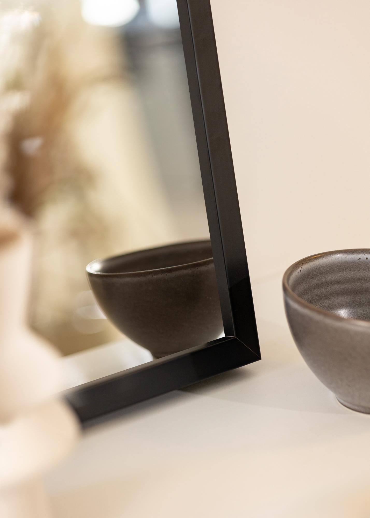 Peili Thor Mustan kehys on 20 mm leveä ja antaa peilille hienovaraisen, mutta selkeän kehyksen. Kehyksen musta väri luo kauniin kontrastin peililasin kanssa ja edistää hienostunutta ilmettä. Syvyydeltään 40 mm peilissä on tukeva tunne, olematta kuitenkaan kömpelö, mikä tekee siitä helpon sijoittaa jopa pienempiin huoneisiin tai ahtaisiin tiloihin.