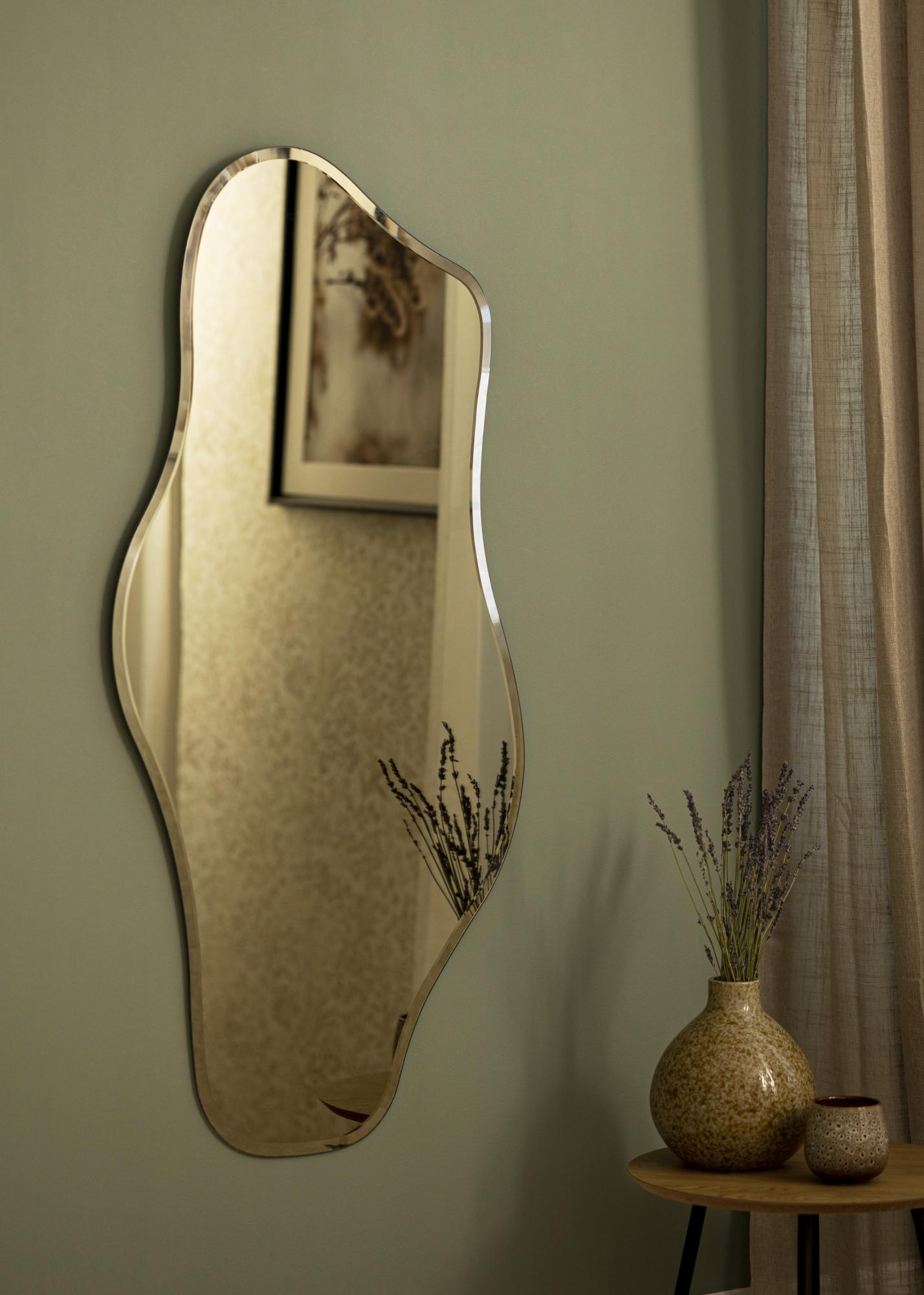 Mahdollisuudella ripustaa peili joko pysty- tai vaakasuoraan voit mukauttaa sen tilaasi ja tyyliisi. Ainutlaatuinen muoto ja lämmin kullanväri tekevät peilistä ei vain heijasta kuvaa, vaan myös valoa, mikä luo lämpimän ja kutsuvan ilmapiirin kotiisi. Valitse tämä peili antamaan huoneellesi välitön päivitys sekä tyyliä että käyttöä.