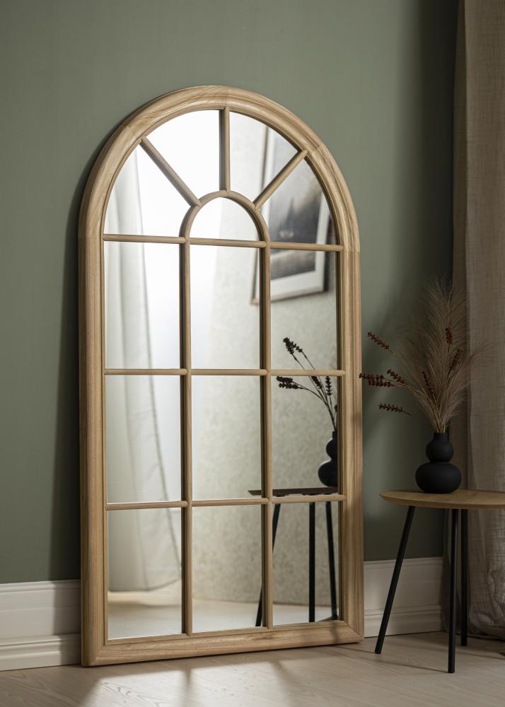 Upptäck den tidlösa elegansen med vår bågformade spegel, en design som för tankarna till historiska gotiska fönster. Med sina generösa mått på 80 x 140 cm erbjuder denna spegel en praktfull vy och blir ett ståtligt inslag i ditt hem. Den naturliga träramen omfamnar spegelglaset och bidrar med en känsla av värme och tradition till din inredning.