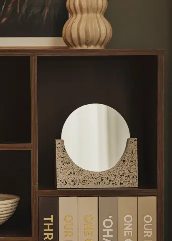 Kuten näet, peili luo yhdessä kukkien, hajuvesipullon ja pienen keramiikka-astian kanssa kodikkaan asetelman. Peiliä käytetään siis koristeena sen tavallisen toiminnon sijaan. Lue alta enemmän siitä, kuinka voit käyttää peiliä luovalla tavalla.