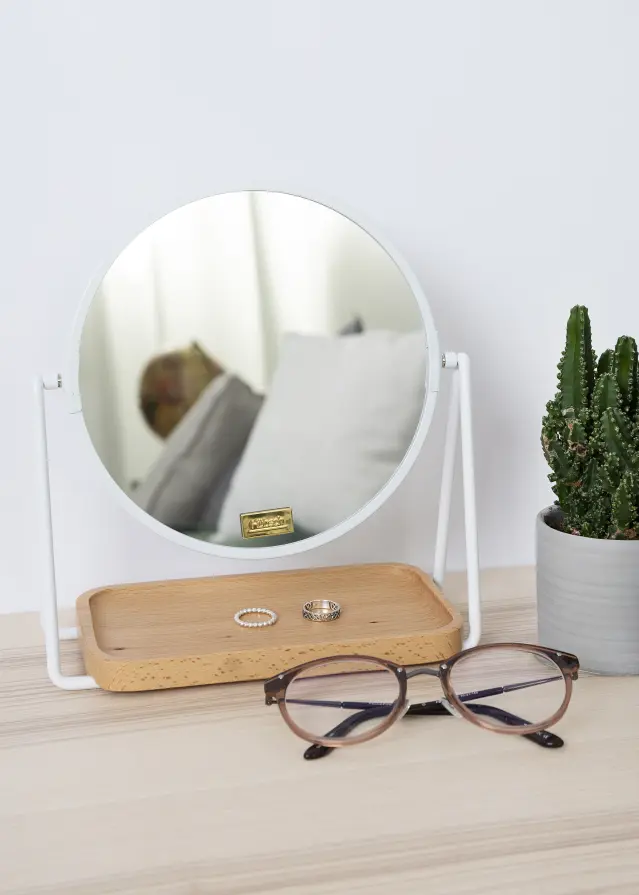 Kätevä, pyöreä pöytäpeili puutarjottimella