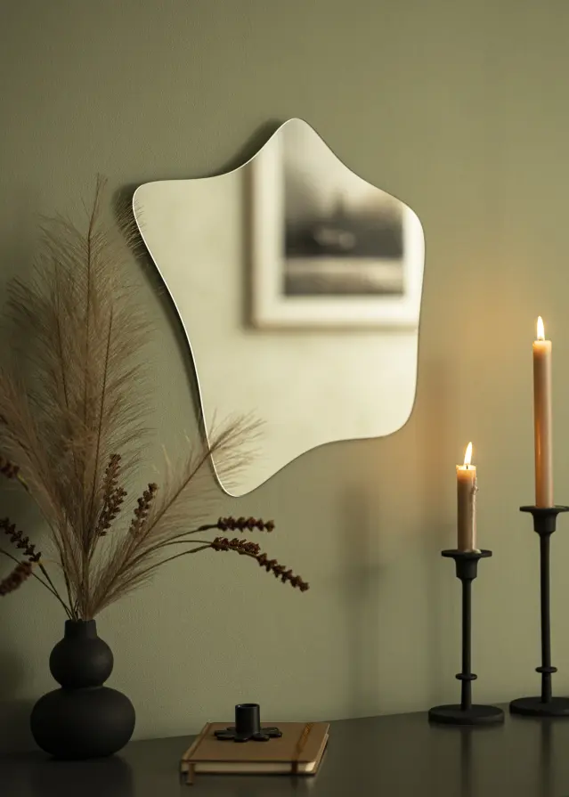 Pienet peilit eivät ole vain kauniita seinäkoristeita – niitä voi käyttää myös muilla tavoilla kodin eri tiloissa. Jos asetat peilin sohvapöydälle tai sivutasolle, saat näyttävän pöytäkoristeen, joka toimii myös osana suurempaa asetelmaa. Peiliä voi käyttää esimerkiksi koristeellisena alustana kukka-asetelmille, ruukuille ja muille sisustusesineille. Erittäin näyttävää!