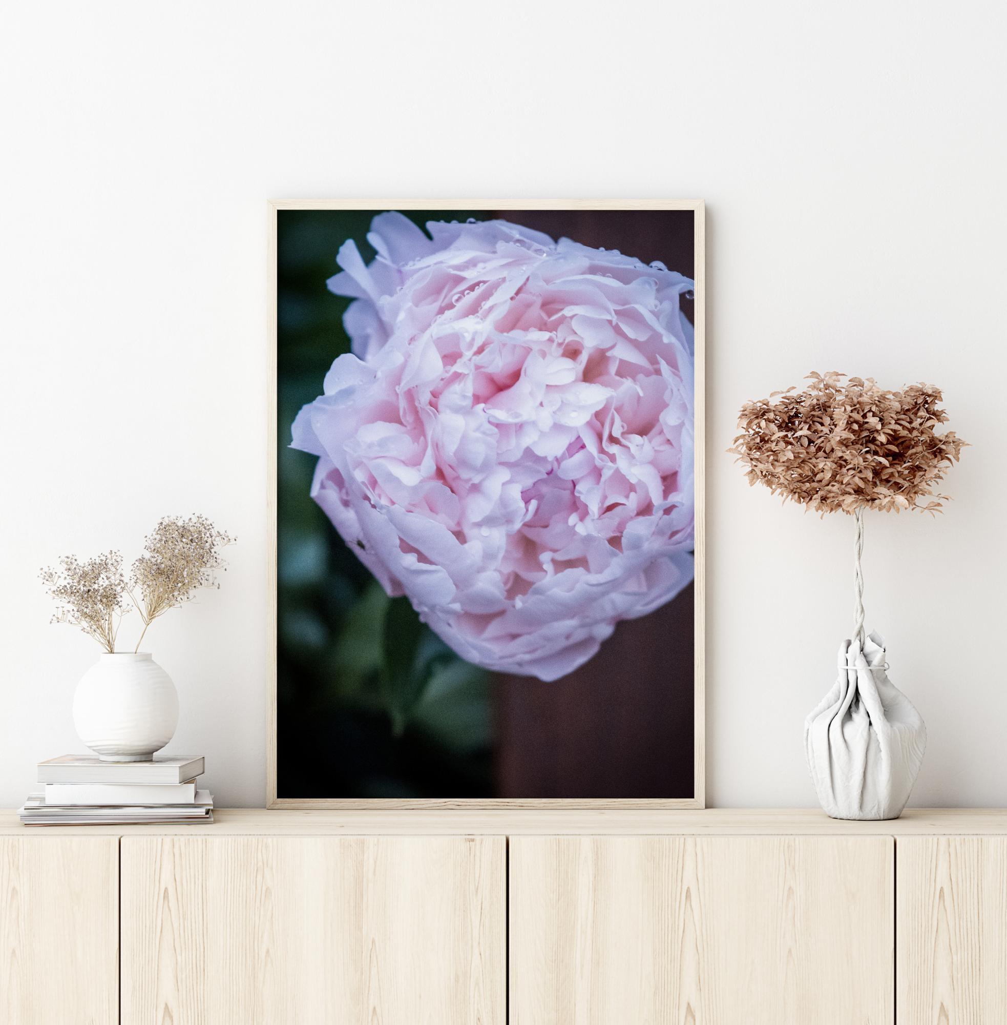 Kaunis lähikuvajuliste vaaleanpunaisesta pionista, jonka terälehdet ovat ryhmittyneet. Jokainen terälehti luo herkän pehmeän ilmeen. Sumea vihreä tausta tuo tähän ihastuttavaan tulosteeseen lisäväriä. Ripusta tämä juliste mihin tahansa huoneeseen piristämään päivääsi.