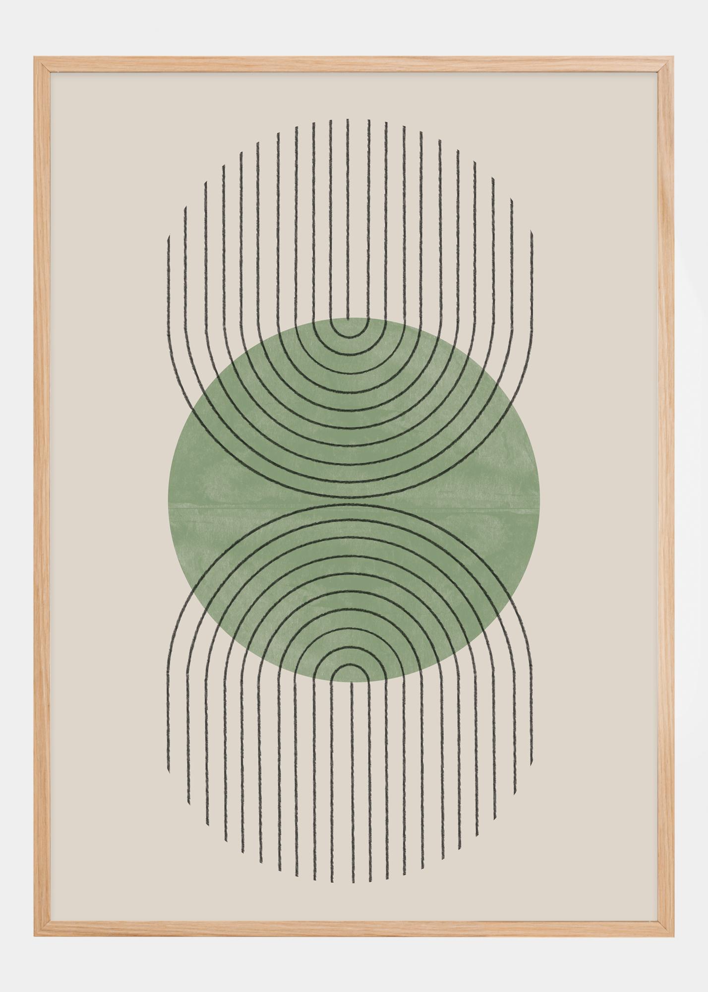 Tämä juliste on minimalistinen taideteos, joka korostaa kyllästettyä vihreää ympyrämuotoa, jota ympäröi sarja mustia viivoja, mikä luo avaruuden ja syvyyden tunteen. Ympyrän vihreä sävy vaihtelee intensiteetiltään, mikä luo visuaalisen vaikutelman ulottuvuudesta ja rakenteesta. Viivat, jotka ulottuvat ulospäin ympyrän reunasta, luovat lähes hypnoottisen vaikutuksen ja kuvaavat geometrisen harmonian.