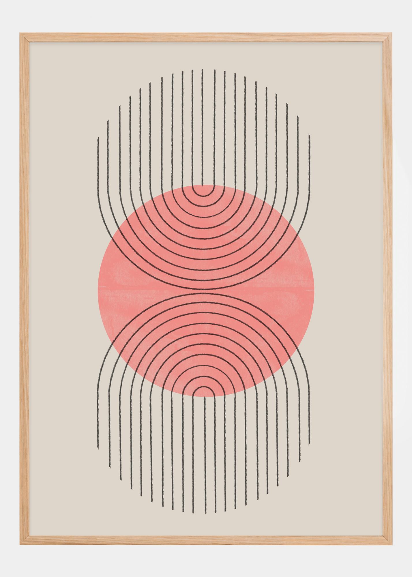 Tämä moderni juliste yhdistää geometrisen muodon yksinkertaisuuden pehmeään, viehättävään persikan sävyyn. Keskellä oleva ympyrä, jota ympäröivät samankeskiset renkaat, muistuttaa rauhallista vesipintaa ja sitä ympäröi kenttä pystysuoria mustia viivoja, jotka näyttävät sykkivän ulospäin. Tämä kontrasti pyöreän muodon ja suorien linjojen välillä luo kiinnostavan dynamiikan ja liikkeen tunteen teokseen.