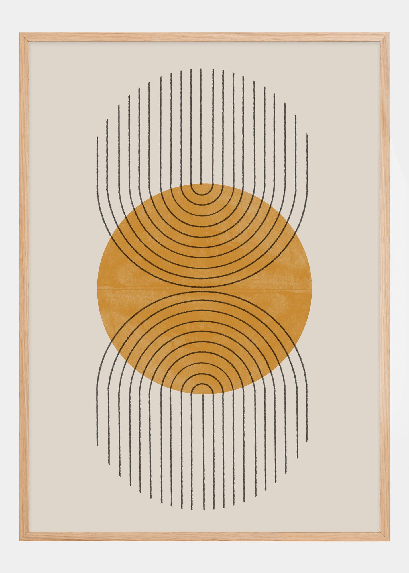 Tämä taiteellinen juliste esittelee voimakasta visuaalista sommitelmaa sijoittamalla keskelle kyllästetyn, kultaisen keltaisen ympyrän, jota ympäröivät pystysuorat mustat viivat luovat optisen harhan laajentumisesta ja supistumisesta. Keltaisen muodon sisällä olevat samankeskiset ympyrät lisäävät syvyyden tunnetta ja antavat orgaanisen laadun muuten tiukan geometriseen kuvioon.