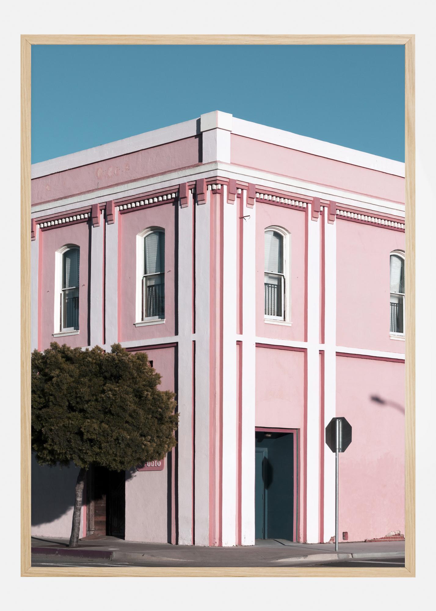 Kaunis kuva vaaleanpunaisesta kaksikerroksisesta rakennuksesta kirkkaan sinisen taivaan alla. Voimakkaiden, eloisien värien ansiosta se herättää rauhallisen, rauhoittavan tunteen. Rakennuksen vasemmalla puolella on pieni pusikkoinen puu, joka melkein estää rakennuksen sisäänkäynnin. Lisää ripaus väriä kotiisi tällä ihastuttavalla kuvalla