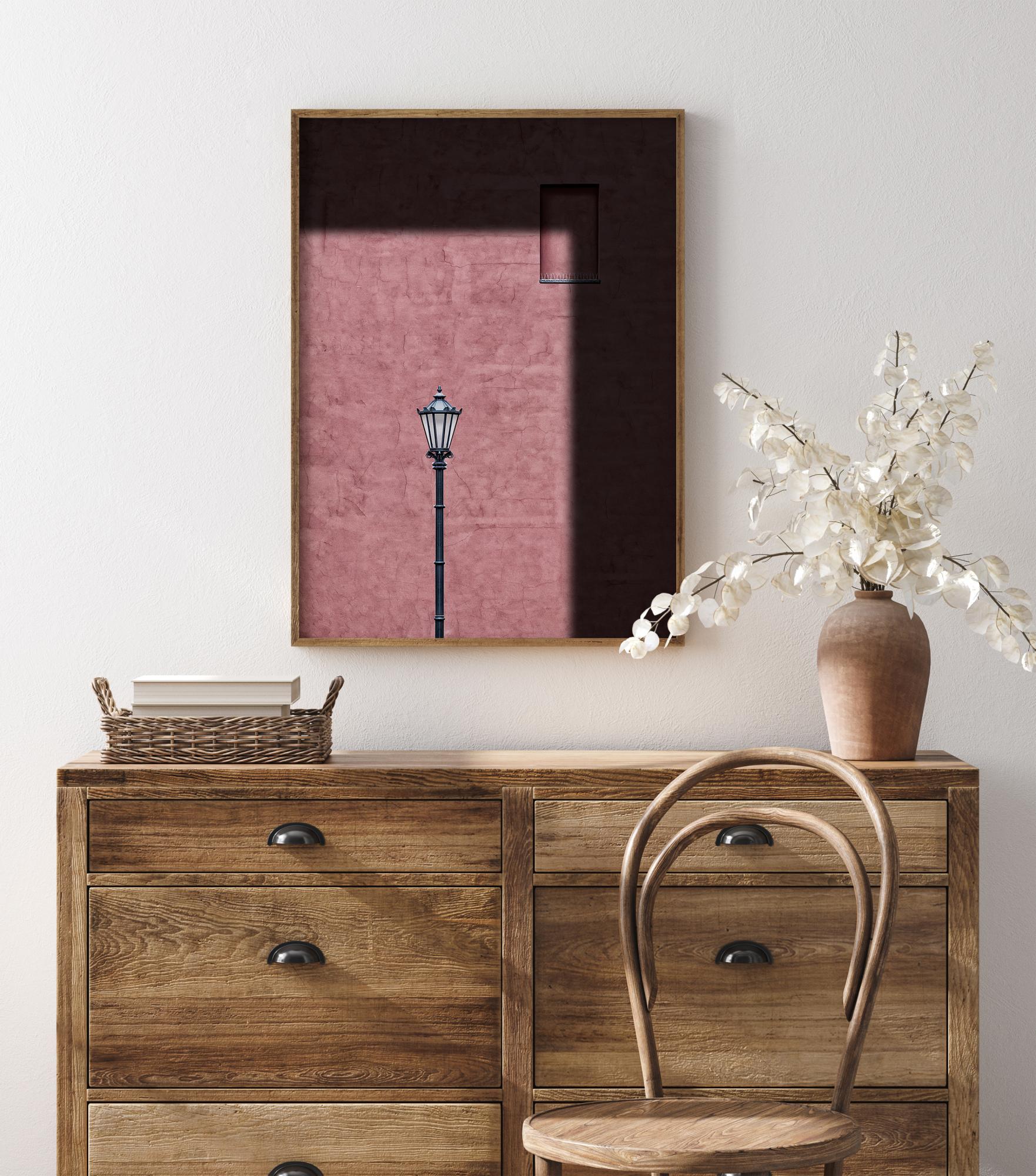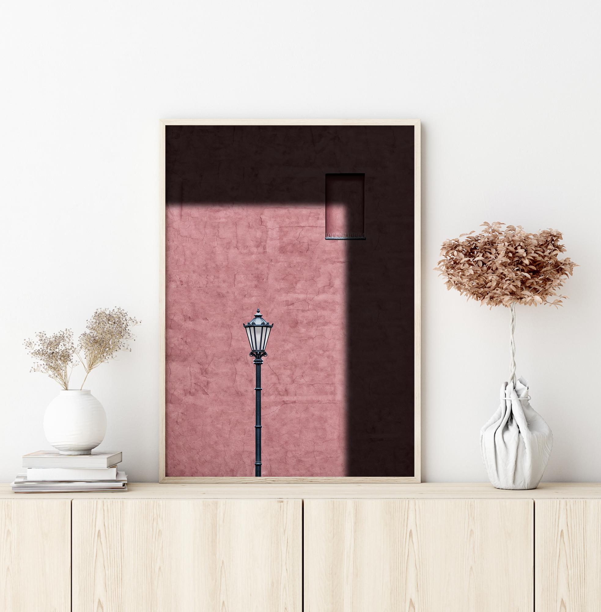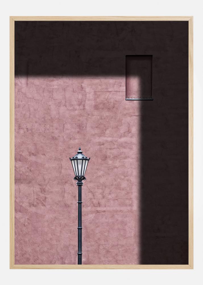 Värikäs kuva vaaleanpunaisesta julkisivusta, jonka keskellä on ulkovalaisin. Luonnollinen auringonvalo paistaa seinälle jättäen kuvan yläosan tummaksi. Oikeassa yläkulmassa näkyy pieni muurattu ikkuna. Tuo valoa kotiisi tällä pehmeän vaaleanpunaisella kuvalla