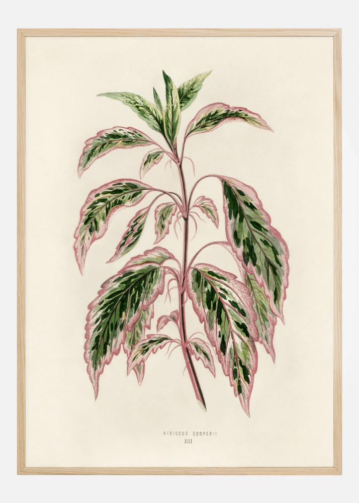 Herkkä kuva värinokkosesta. Pehmeän beigen värinen tausta korostaa kauniita vaaleanpunaisia ja vihreitä lehtiä. Pehmeän sävyisten lehtiensa ansiosta tämä roikkuva kasvi kuvastaa rauhallisuuden tunnetta. Täydellinen lahja kaikille kasveja rakastaville.